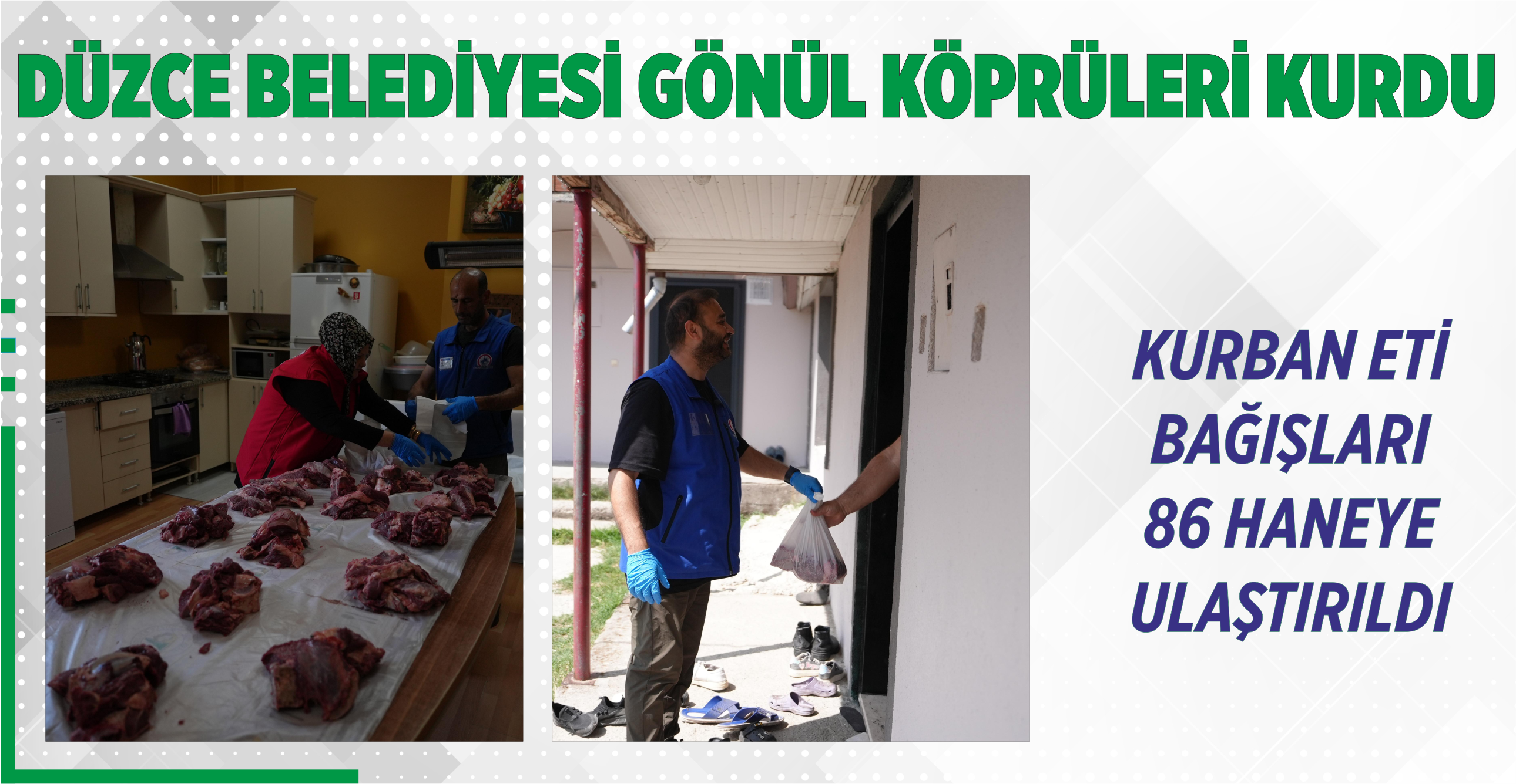 Düzce Belediyesi, “Kurban Paylaşmaktır” anlayışıyla hareket ederek hayırsever vatandaşlarla ihtiyaç sahipleri arasında gönül köprüleri kurdu. Sosyal Yardım İşleri Müdürlüğü ekipleri, Kurban Bayramı boyunca gerçekleştirdikleri dağıtım faaliyetleri ile bağışçıların emanetlerini ihtiyaç sahiplerine ulaştırdı.
