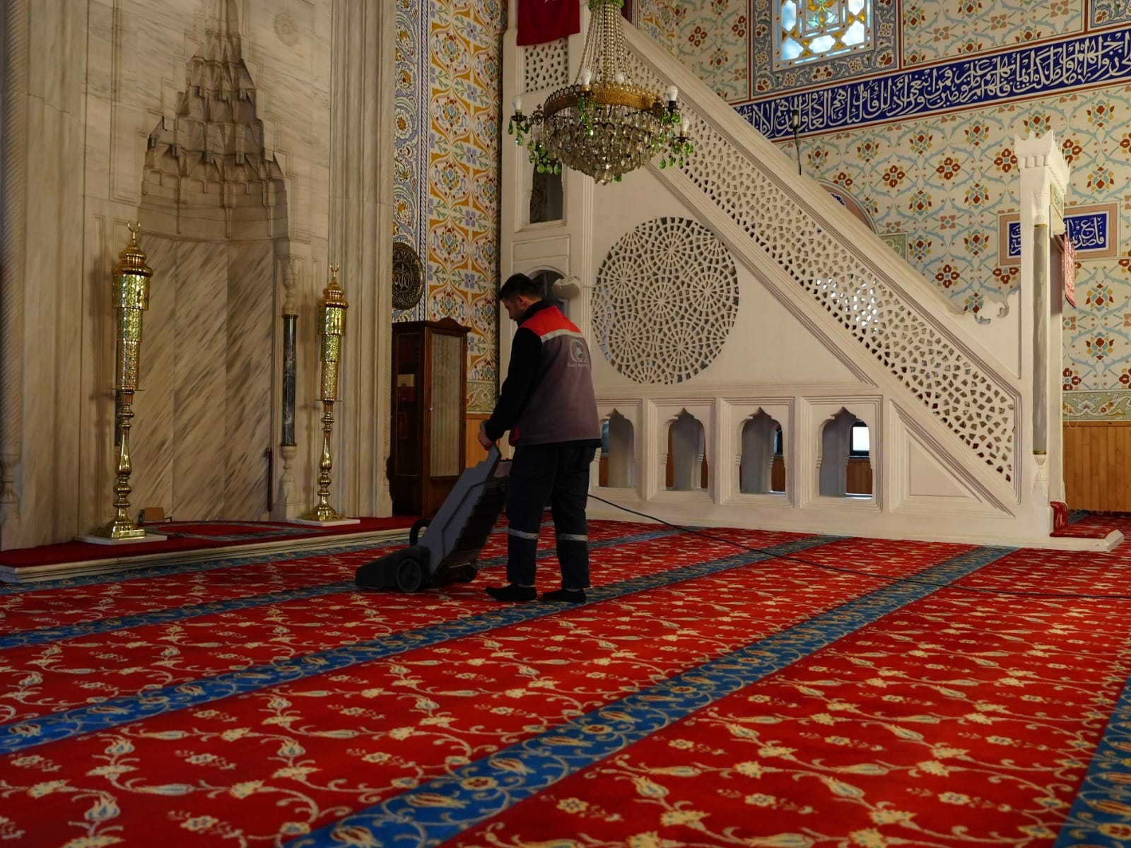 Bu çerçevede Müdürlük bünyesinde ibadethanelerin temizliği için oluşturulan özel ekiplerle birlikte 63 mahalle genelinde devam eden çalışmaların üçüncü turunda camilerin şadırvanlarından duvarlarına, halı döşemelerinden pencerelerine, avizelerinden minberine kadar köşe bucak temizleniyor.