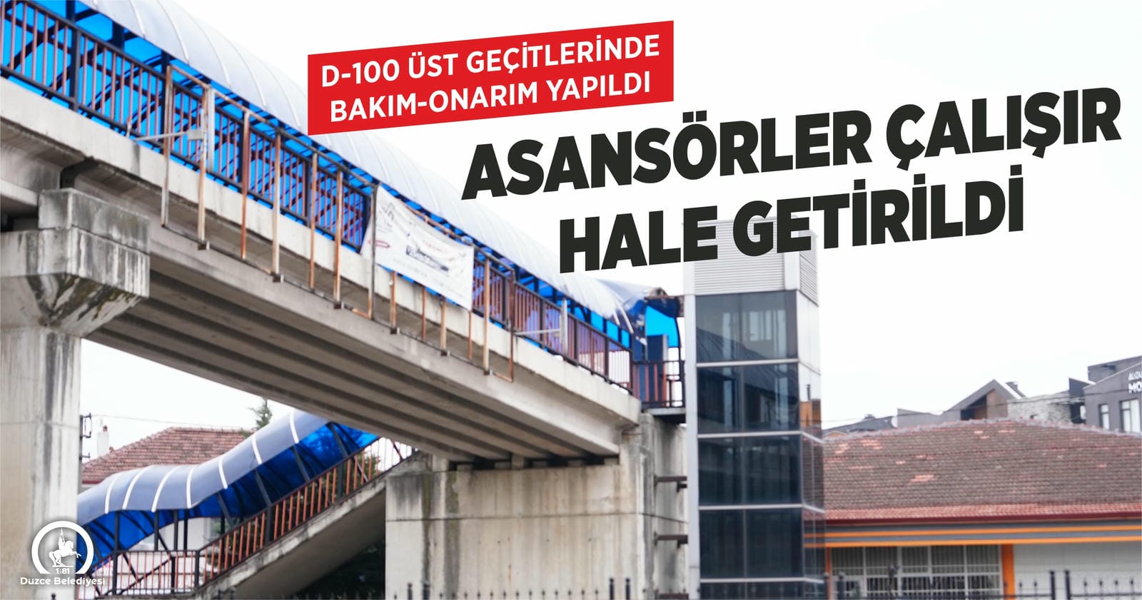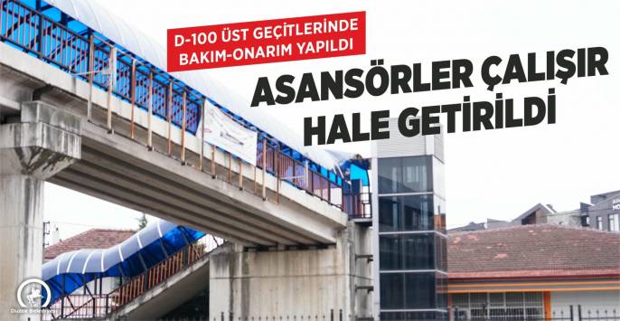 Düzce D-100 Karayolu üzerindeki üst geçitlerde bulunan 6 asansör Düzce Belediyesi tarafından yapılan bakım ve onarım çalışmaları ile yeniden çalışır hale getirildi. Asansörlere kasıtlı zarar verenlerin güvenlik kameralarından tespit edilerek haklarında cezai işlem uygulanacağı belirtildi.