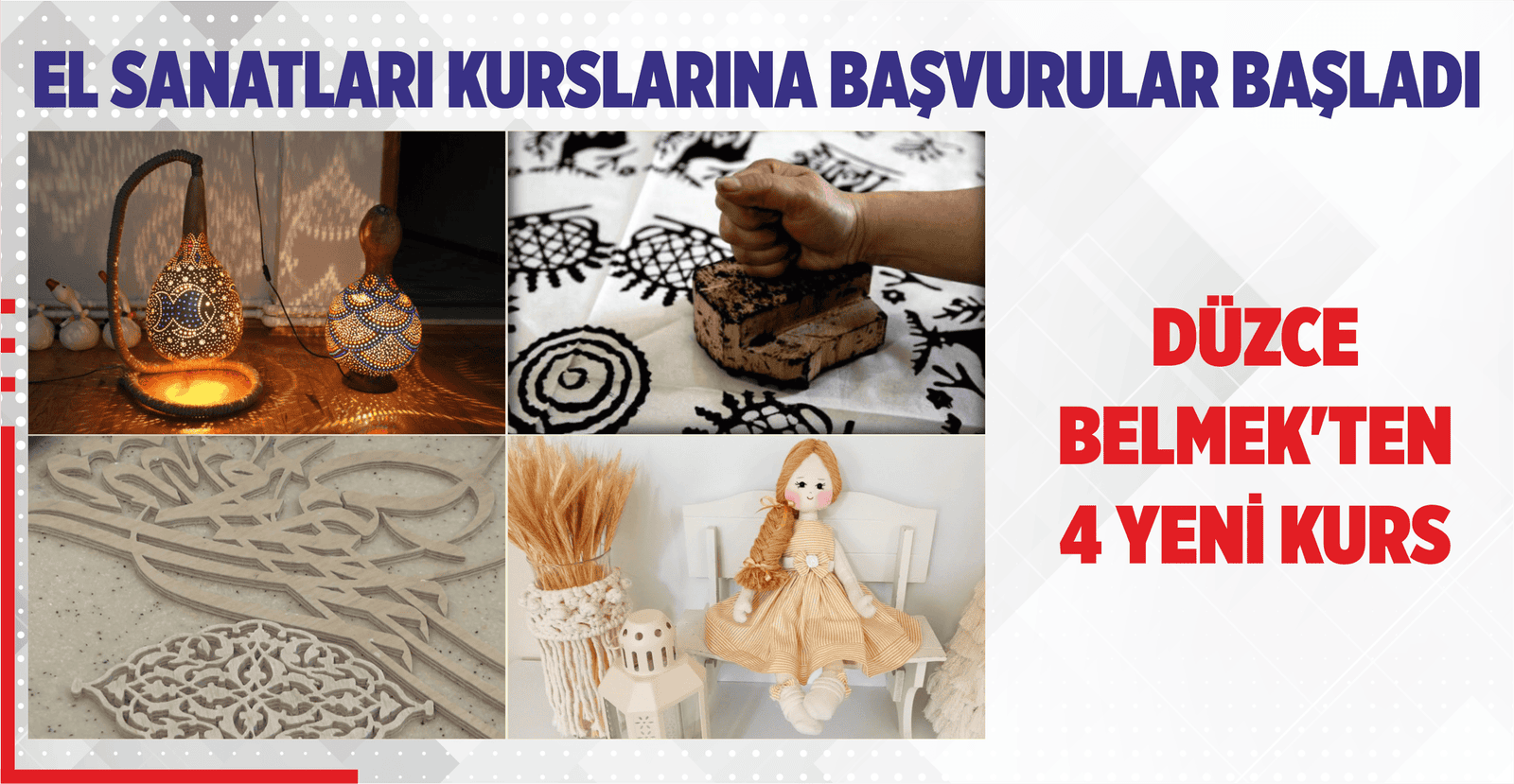 Düzce Belediyesi Meslek Edindirme Kursları (BELMEK) el sanatları alanında yeni kurslar düzenleyecek. Naht Sanatı, Su Kabağı Lamba Yapımı, Tokat Taş Baskı Yapımı ve Bez Bebek Yapımı alanında açılacak kurslar için başvurular başladı.