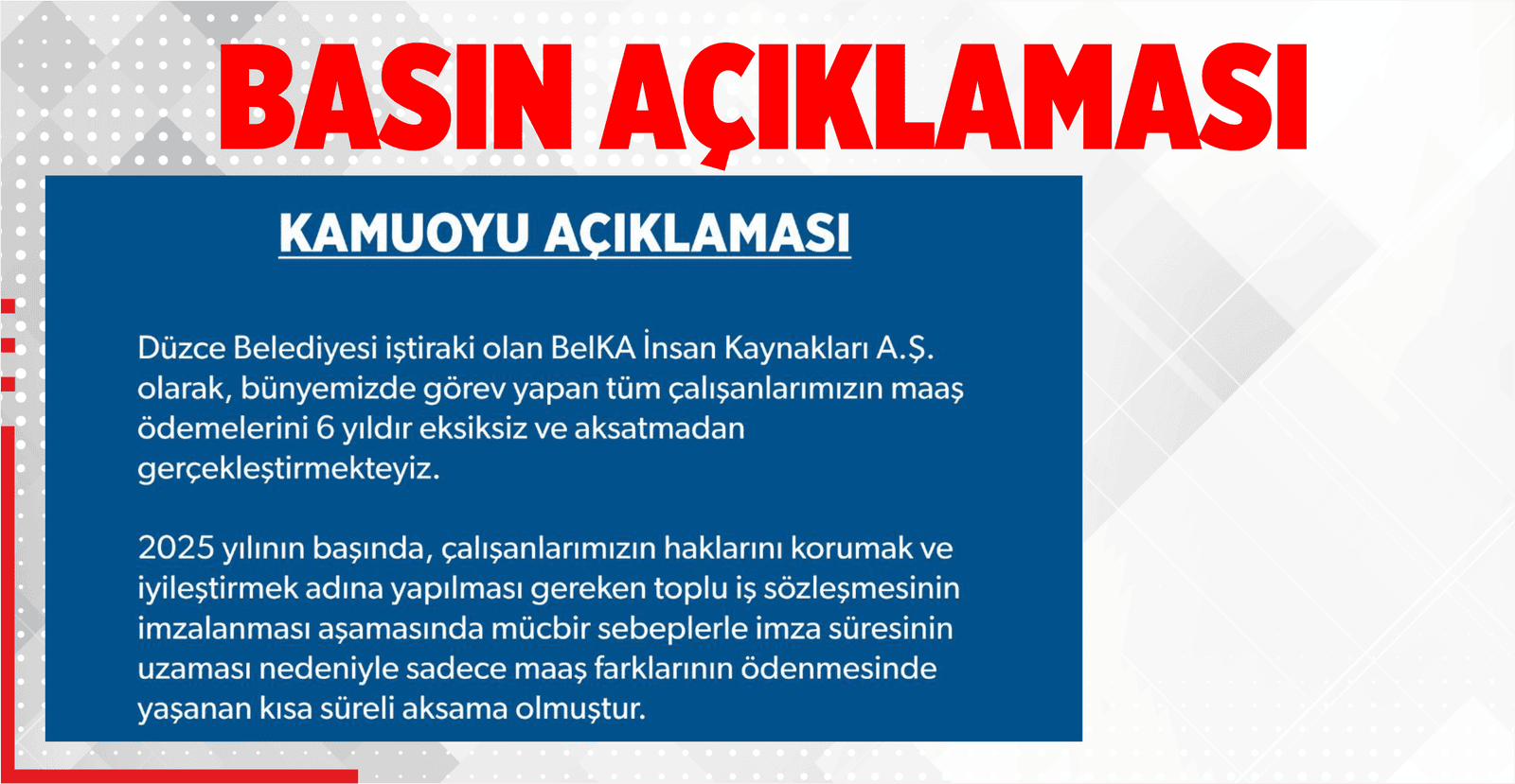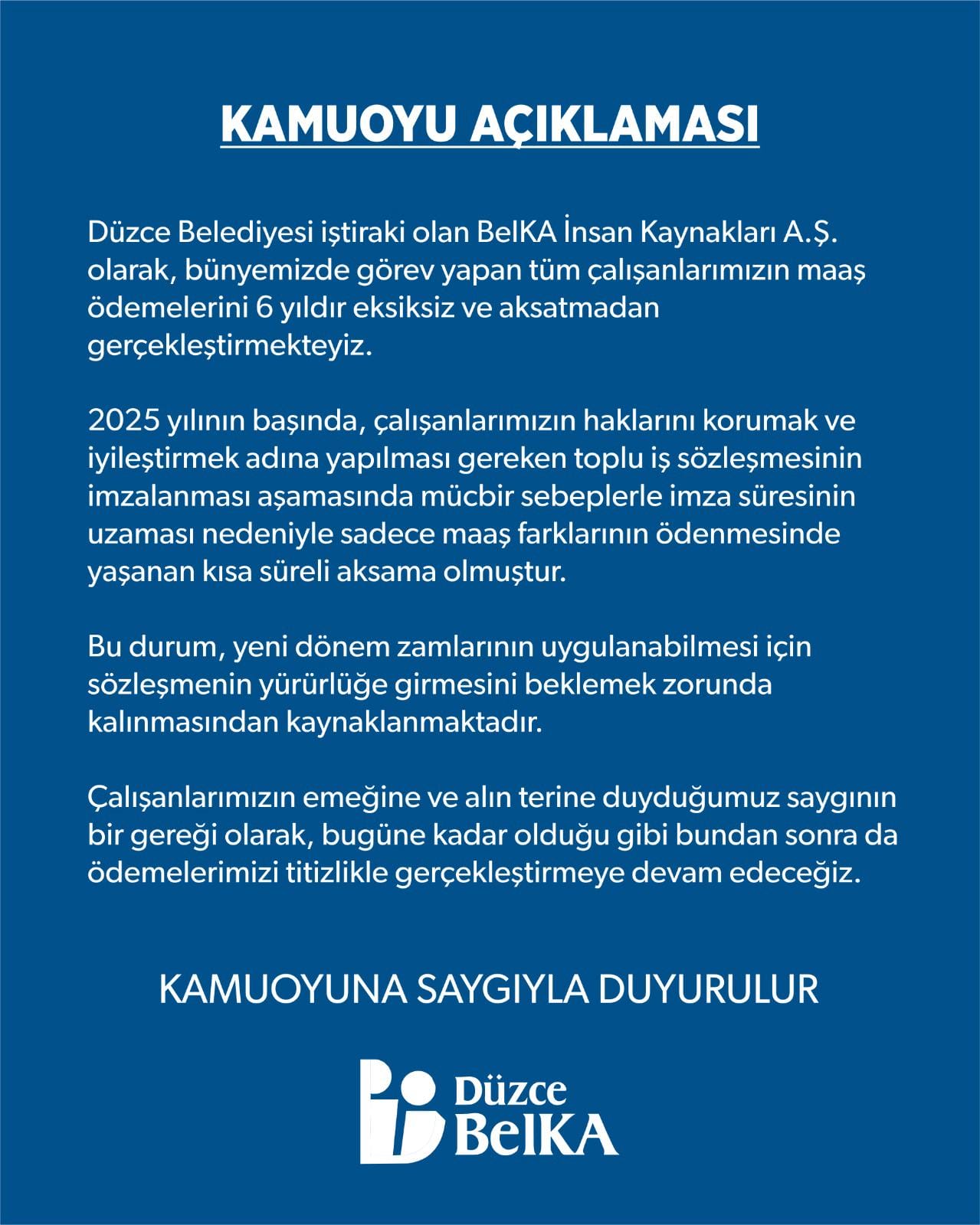 Düzce Belediyesi iştiraki olan Belka İnsan Kaynakları A.Ş. olarak, bünyemizde görev yapan tüm çalışanlarımızın maaş ödemelerini 6 yıldır eksiksiz ve aksatmadan gerçekleştirmekteyiz.