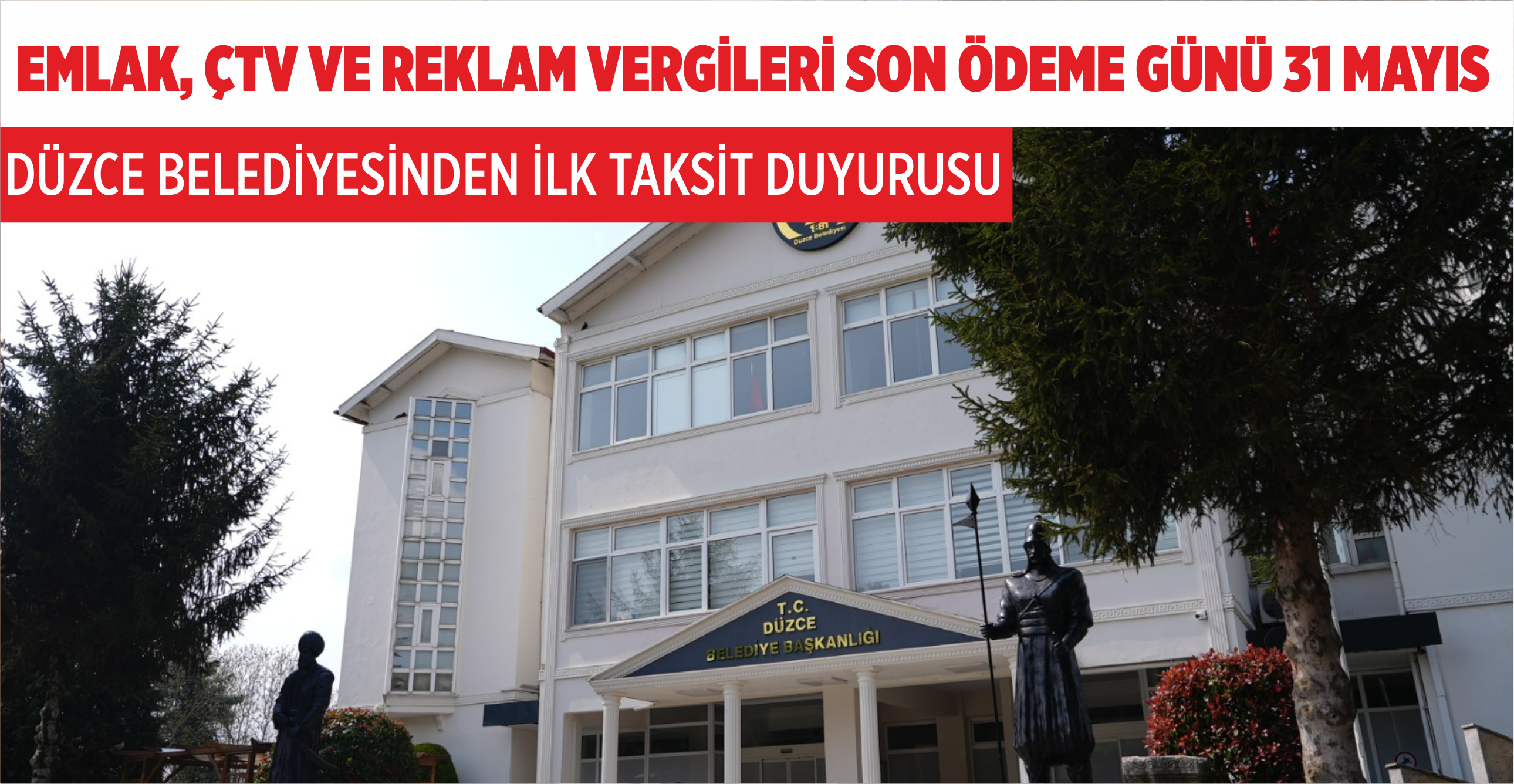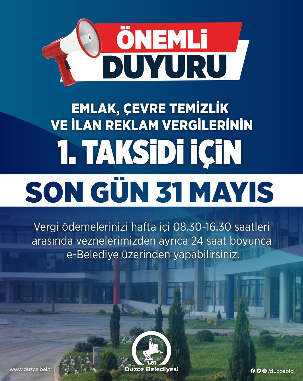 Düzce Belediyesi, emlak, çevre temizlik ve ilan reklam vergilerinin ilk taksit ödeme gününün 31 Mayıs 2025 tarihinde sona ereceğini duyurdu.