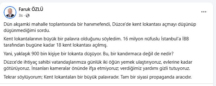Düzce Belediye Başkanı Dr. Faruk Özlü, mahalle ziyaretleri kapsamında Bahçeşehir Demetevler Mahallesi’nde yaşayan Düzcelilere misafir oldu. Vatandaşlarla tek tek ilgilenen ve taleplerini alan Başkan Özlü, gelen sorular arasında İBB’nin İstanbul’da açtığı Kent Lokantaları’na ilişkin sosyal medya hesabından bir paylaşım yaptı. Toplantıya katılan Düzceli vatandaşın ‘Düzce’ye de Kent Lokantası açmayı düşünüyor musunuz’ sorusu üzerine toplantıda verdiği yanıta ek olarak sosyal medya hesaplarından Düzcelilere seslenen Başkan Özlü, şu ifadeleri kullandı: “Dün akşamki mahalle toplantısında bir hanımefendi, Düzce'de kent lokantası açmayı düşünüp düşünmediğimi sordu. Kent lokantalarının büyük bir palavra olduğunu söyledim. 16 milyon nüfuslu İstanbul'a İBB tarafından bugüne kadar 18 kent lokantası açılmış. Yani, yaklaşık 900 bin kişiye bir lokanta düşüyor. Bu, bir kandırmaca değil de nedir? Biz, Düzce'de ihtiyaç sahibi vatandaşlarımıza günlük iki öğün yemek ulaştırıyoruz, evlerine kadar götürüyoruz. İnsanları kameralar önünde ifşa etmiyoruz; verdiğimiz yardımı gizli tutuyoruz. Tekrar söylüyorum; Kent lokantaları bir büyük palavradır. Tam bir siyasi propaganda aracıdır” şeklinde paylaşım yaptı.