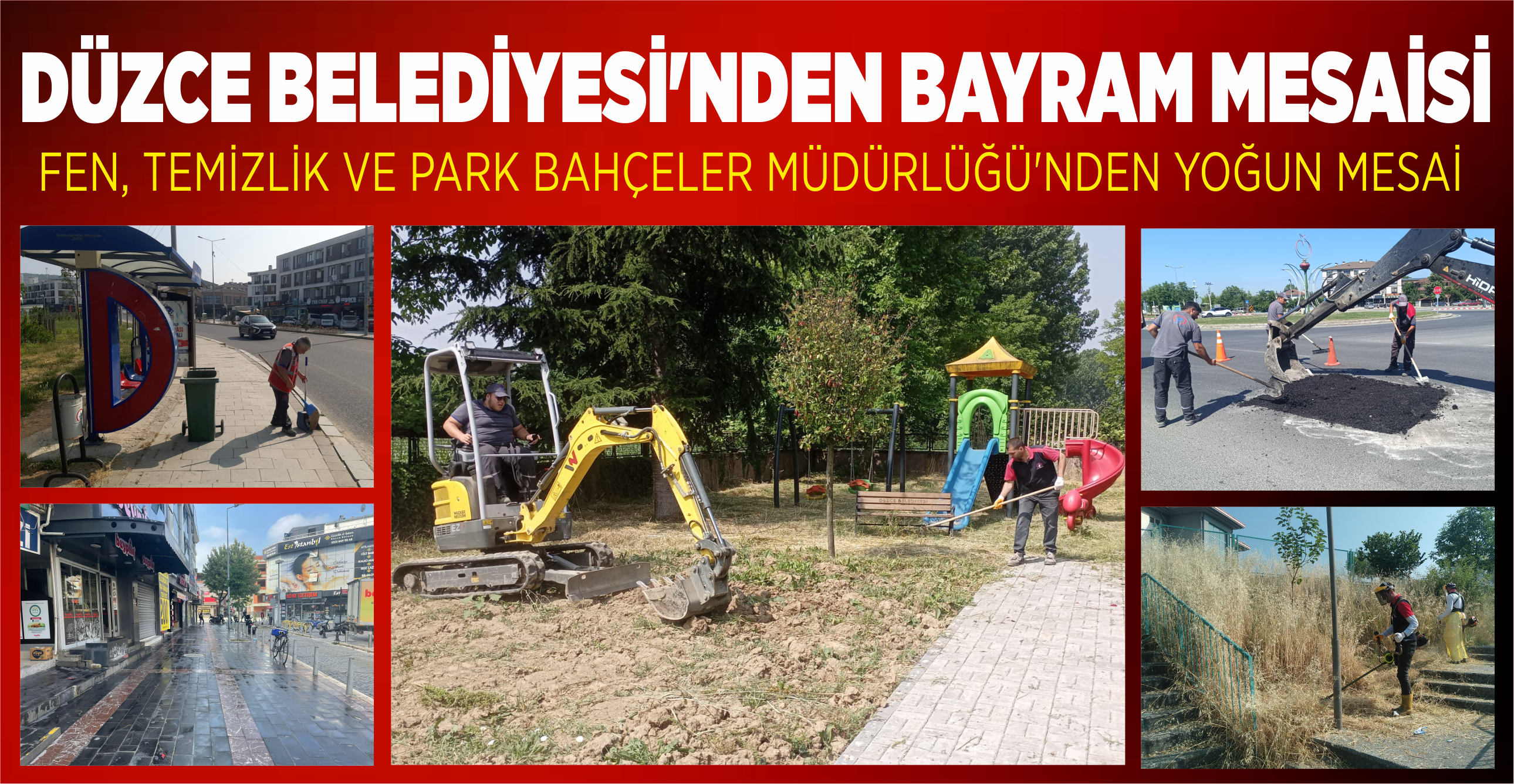 Düzce Belediyesi, Kurban Bayramı tatilinde de şehri daha temiz, daha düzenli ve yaşanabilir hale getirmek için çalışmalarına tüm hızıyla devam etti. Vatandaşların bayramı huzur içinde geçirebilmesi adına Fen İşleri, Temizlik İşleri ve Park Bahçeler müdürlükleri ekipleri sahada yoğun mesai sarf etti.