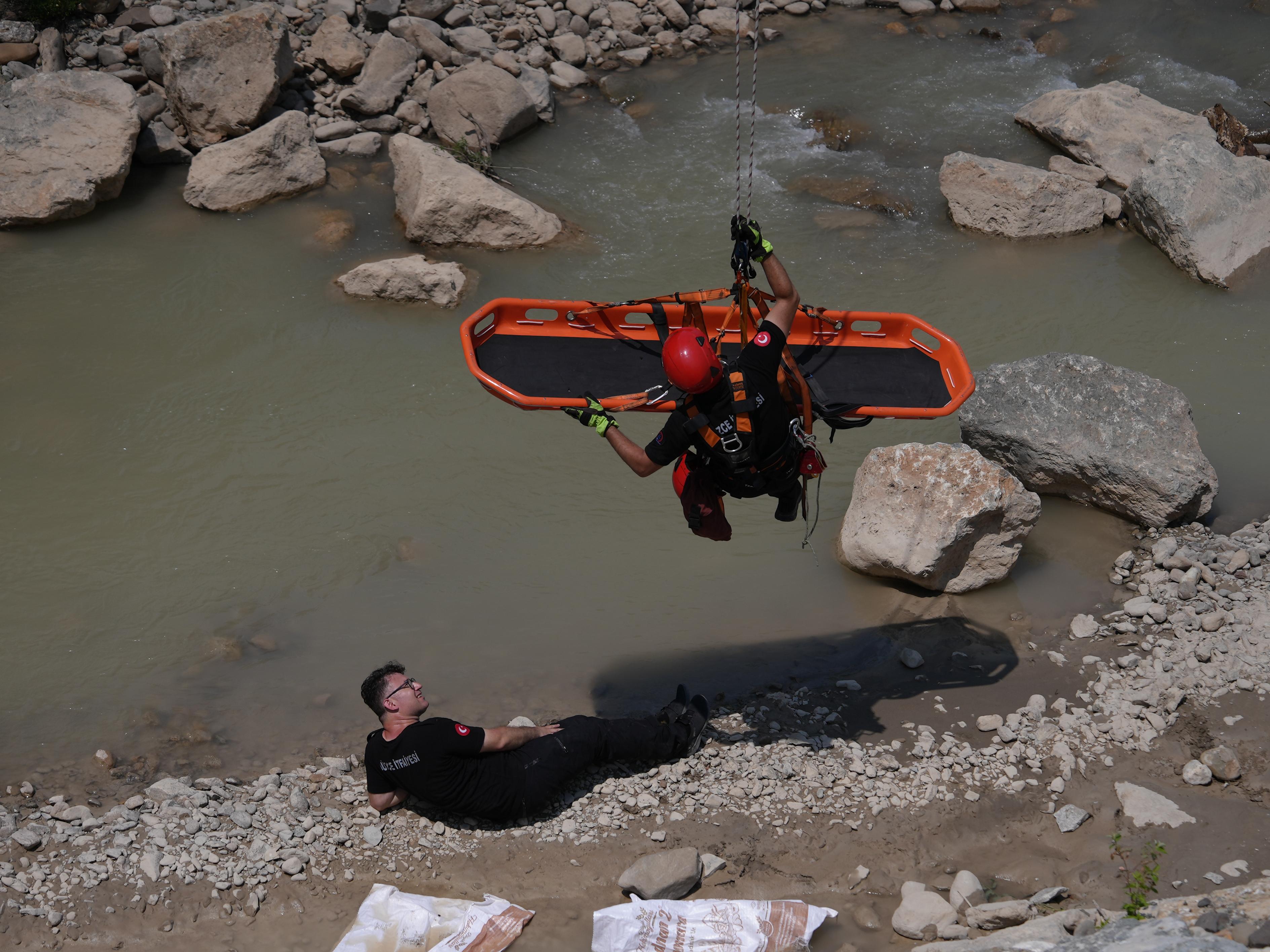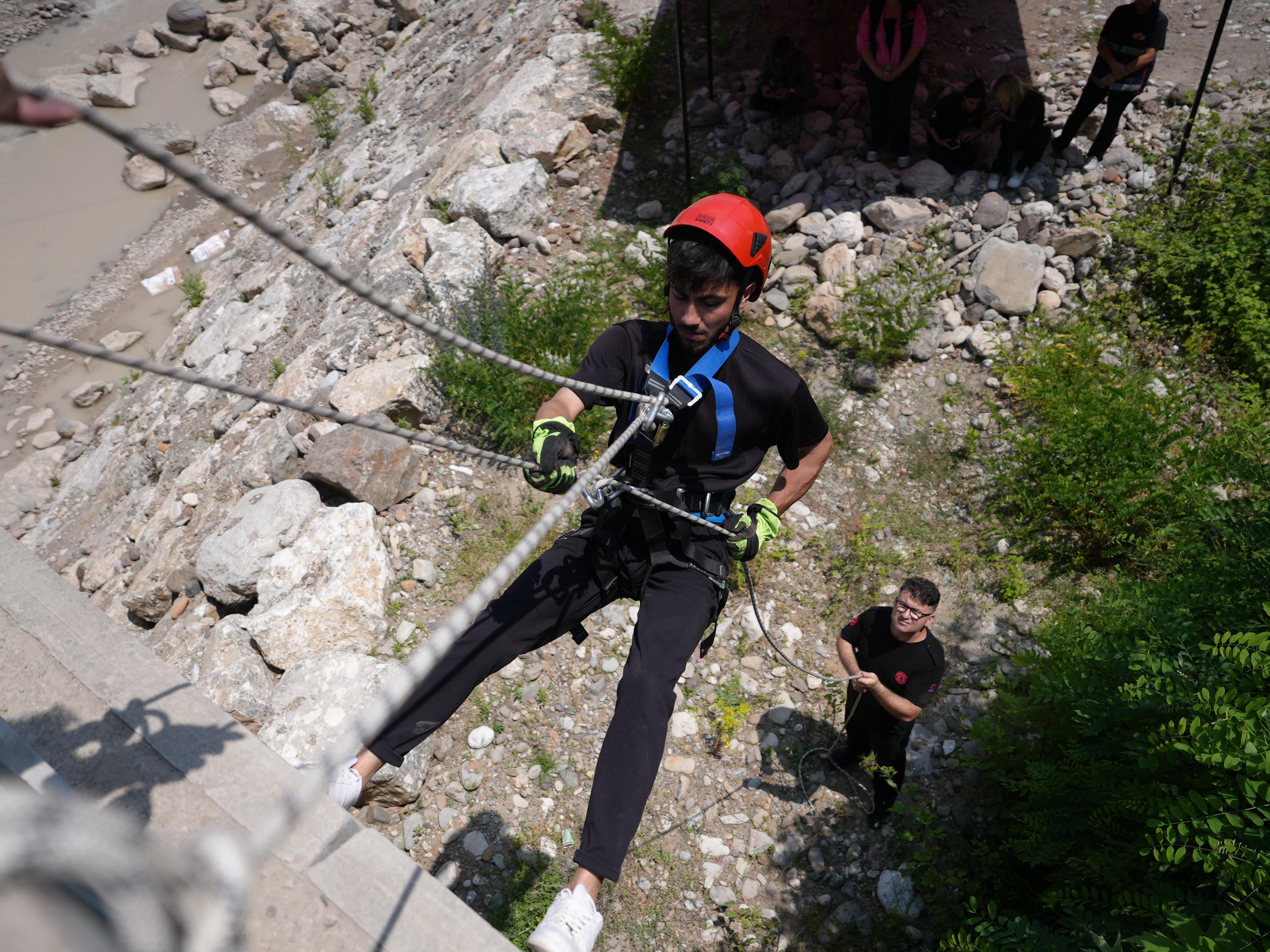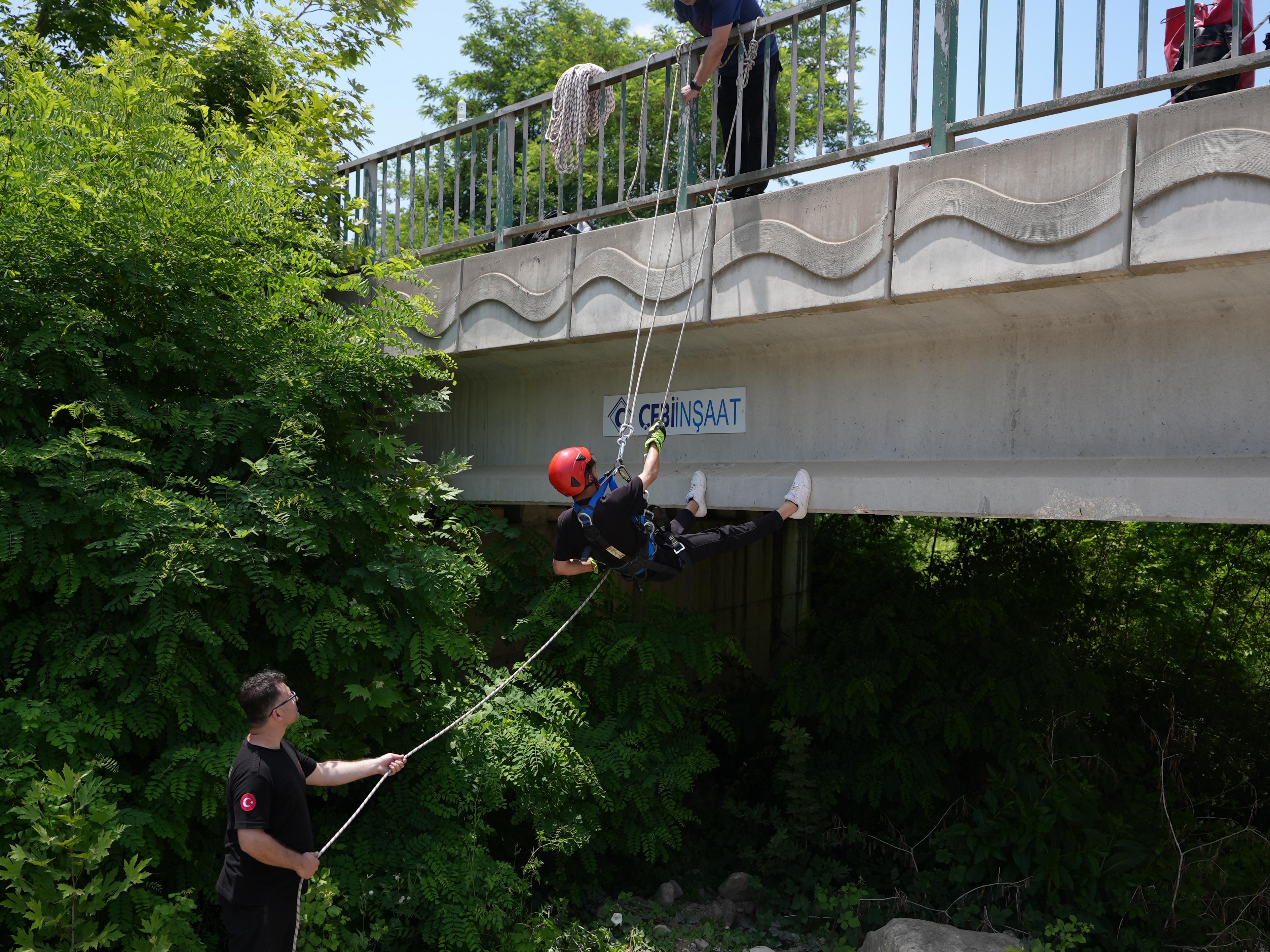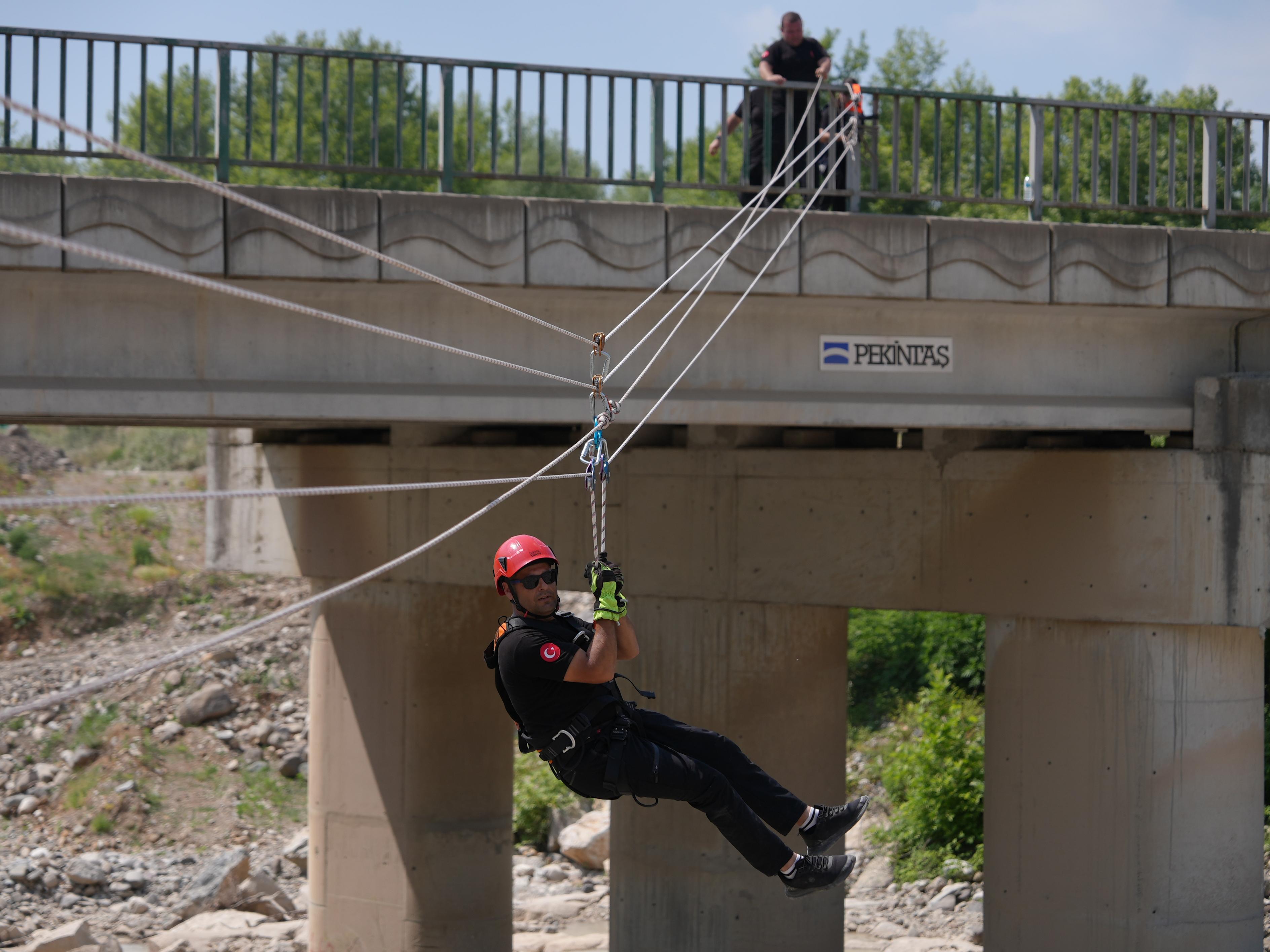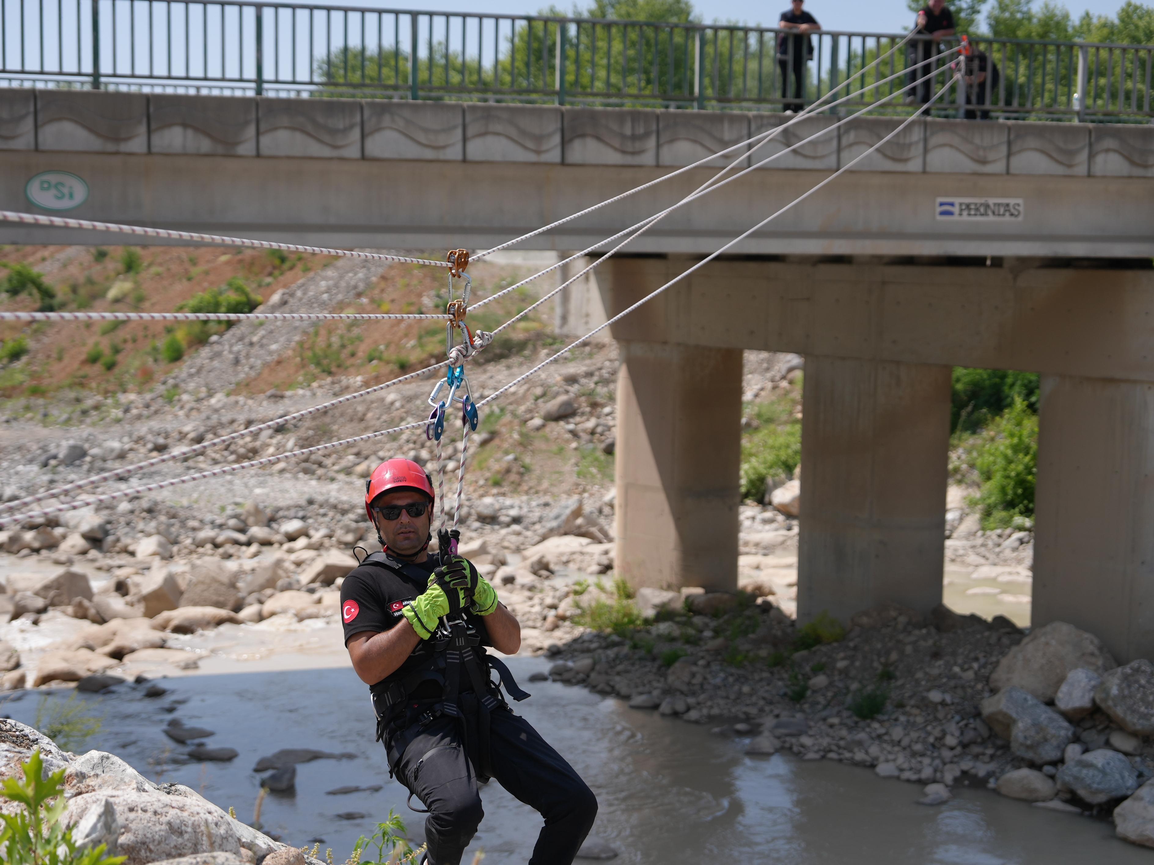 Tatbikatta, iki yamaç arasına kurulan havai hat sistemi üzerinden yapılan kurtarma operasyonunda; kurtarma ekibi, suyun ortasında mahsur kalan bir kazazedeyi sedyeye alarak hat üzerinden aşağıya indirdi ve güvenli bir şekilde tahliye etti. Senaryo, gerçeğe yakın koşullarda başarıyla tamamlandı.