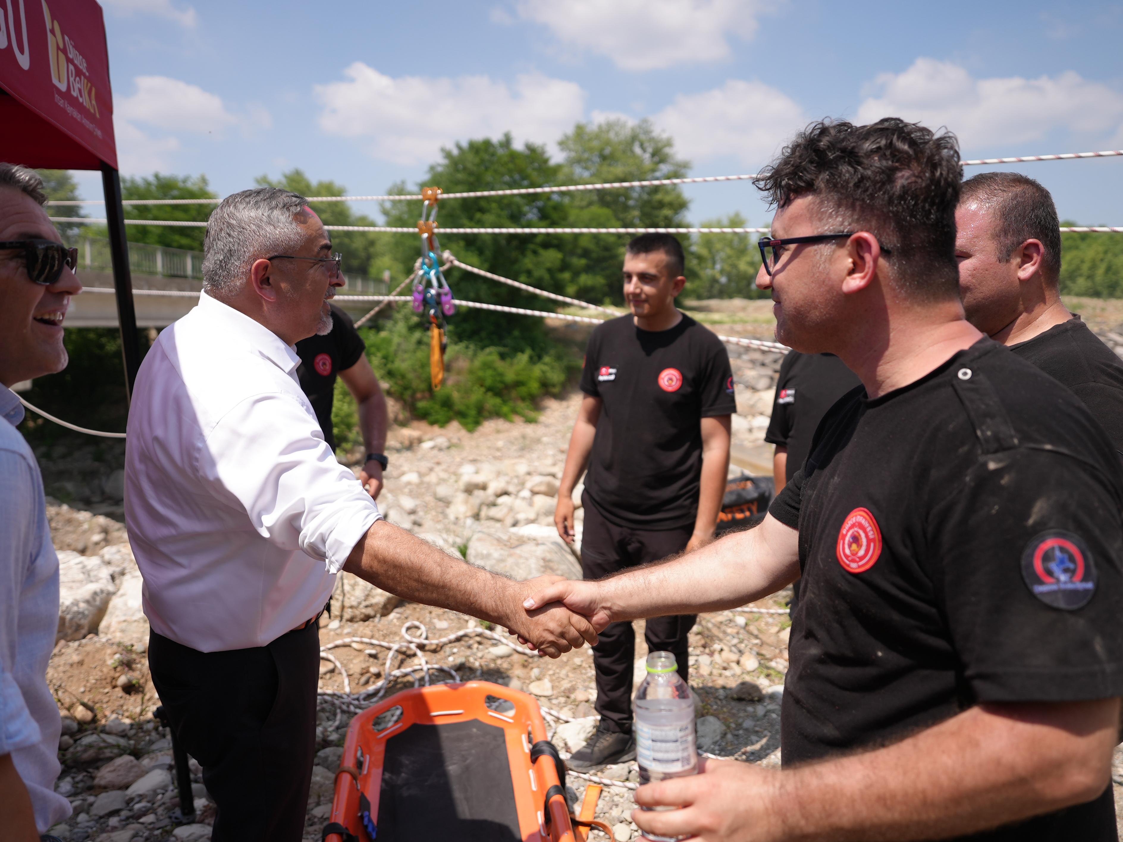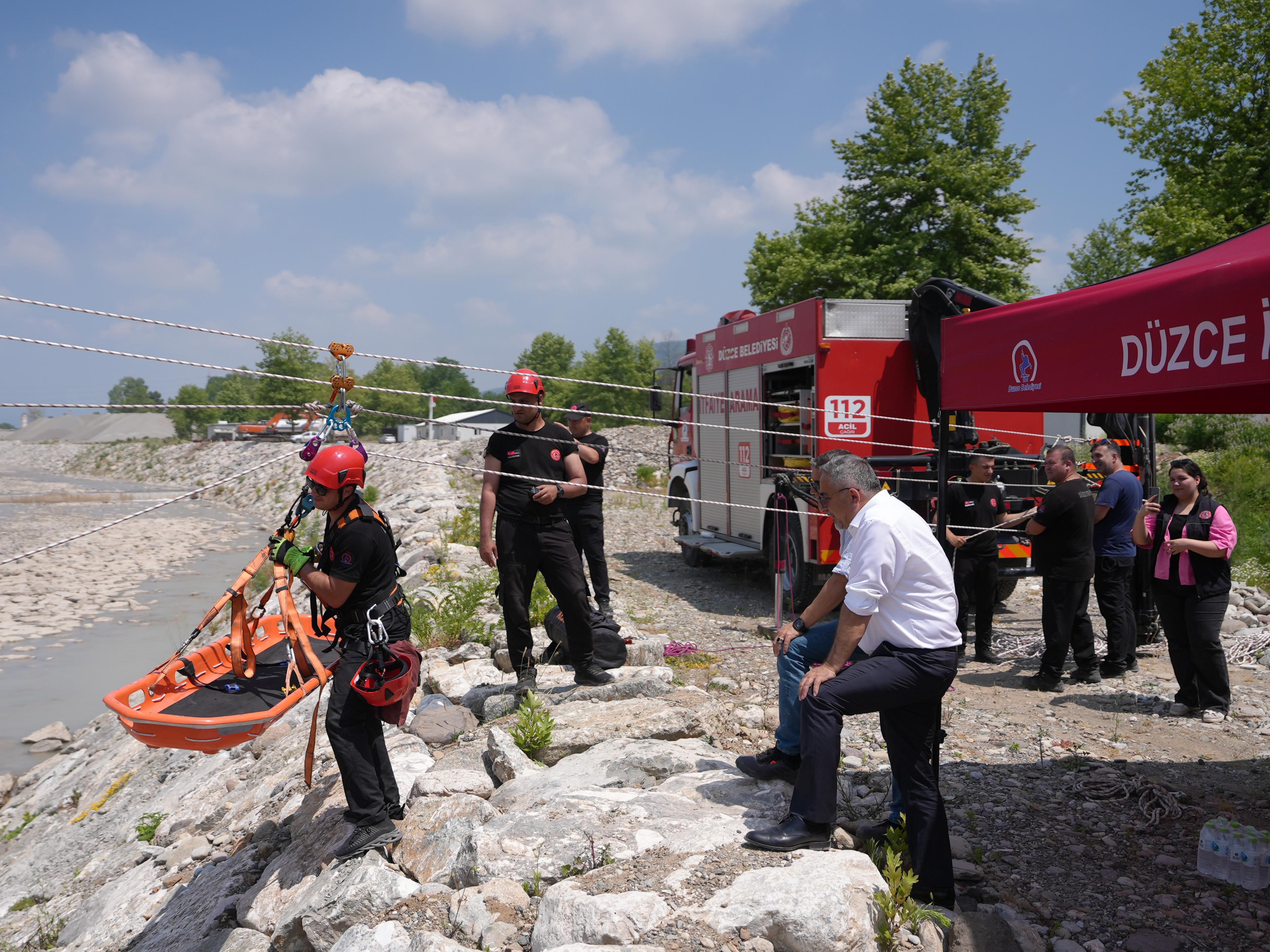 Düzce İtfaiye Müdürlüğü tarafından Develi Besni Köyü Uğur Suyu üzerinde düzenlenen kurtarma tatbikatı başarıyla tamamlandı. Tatbikatta, derede mahsur kalan bir kazazedenin havai hat sistemi kullanılarak güvenli alana taşınması senaryosu uygulandı. Tatbikata Belediye Başkan Yardımcısı Mehmet Saygun ve İtfaiye Müdürü Mehmet Ali Kahraman da katıldı.