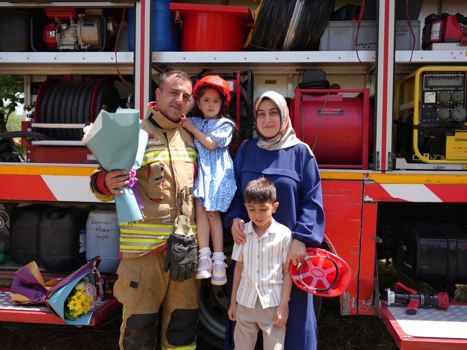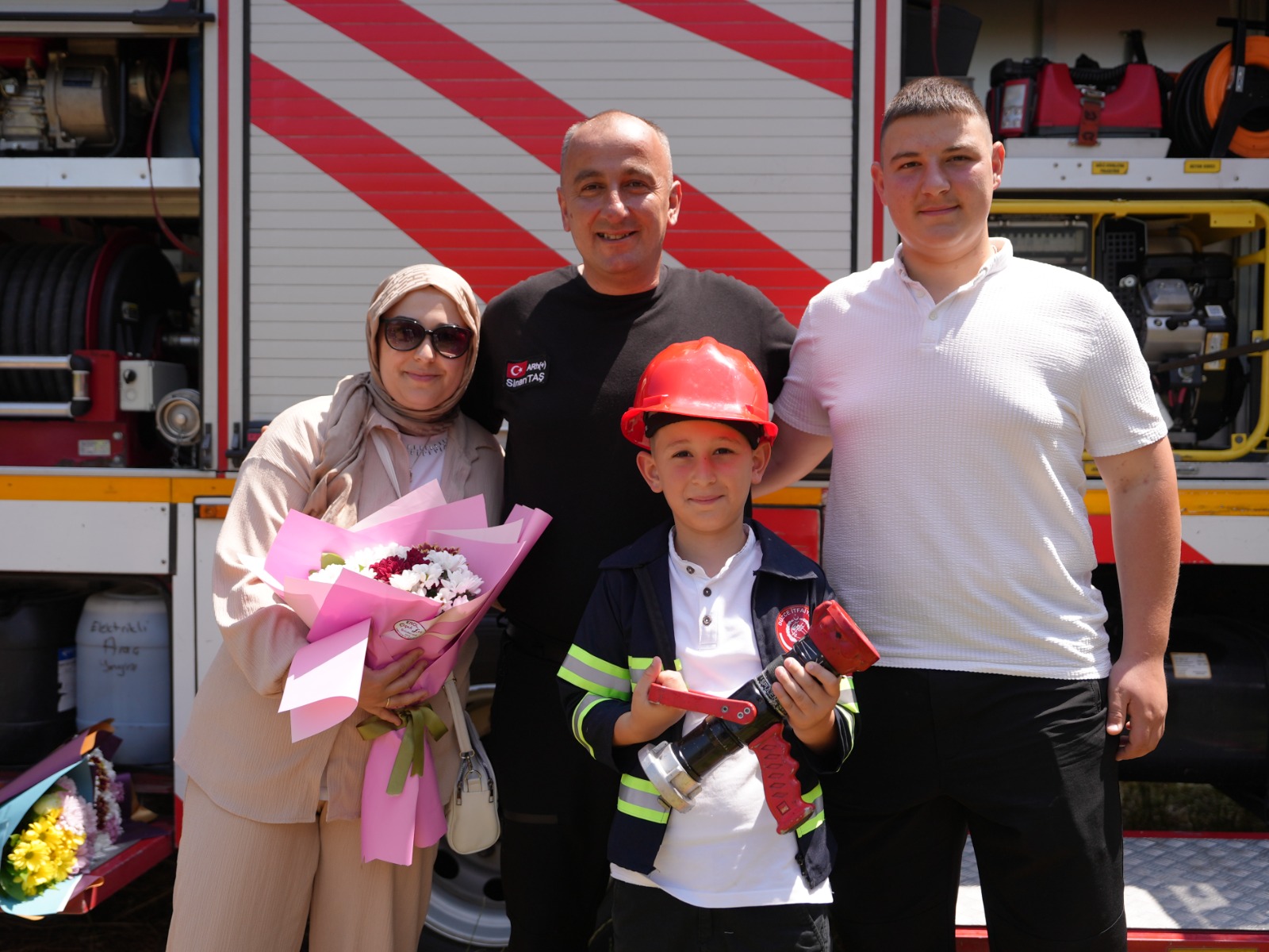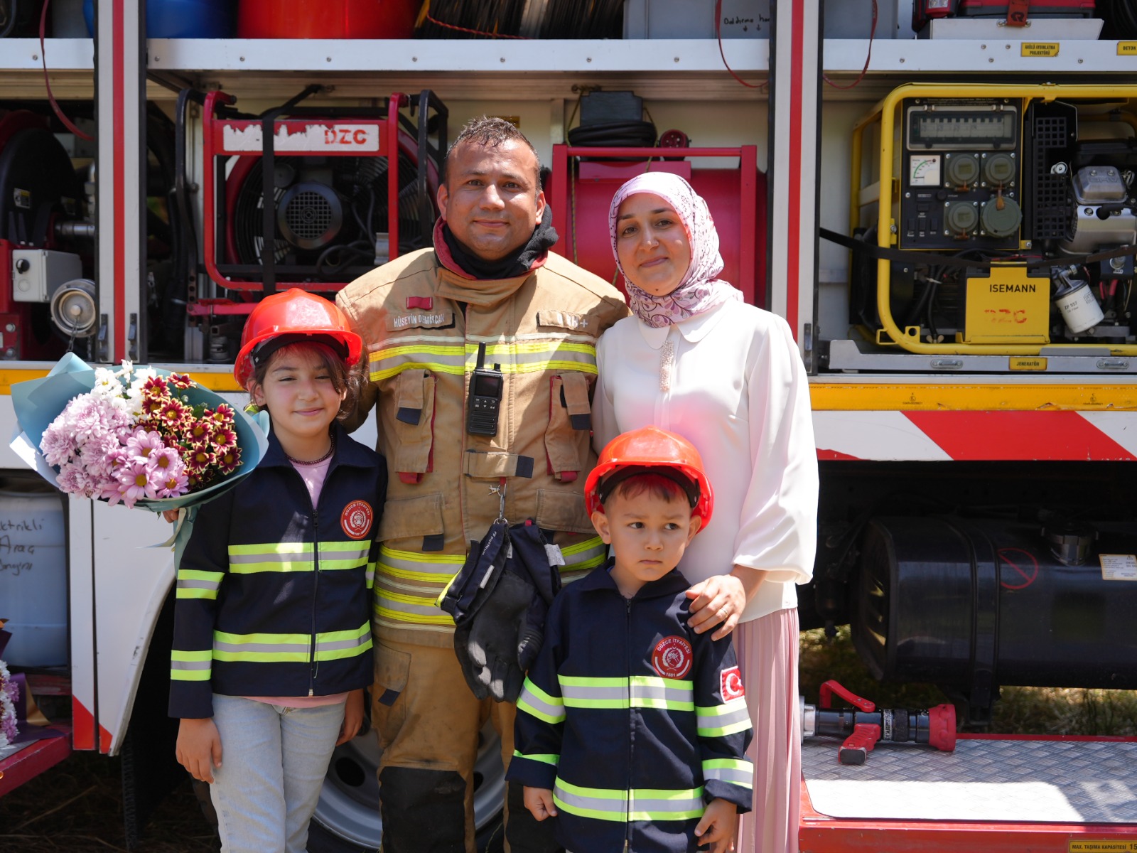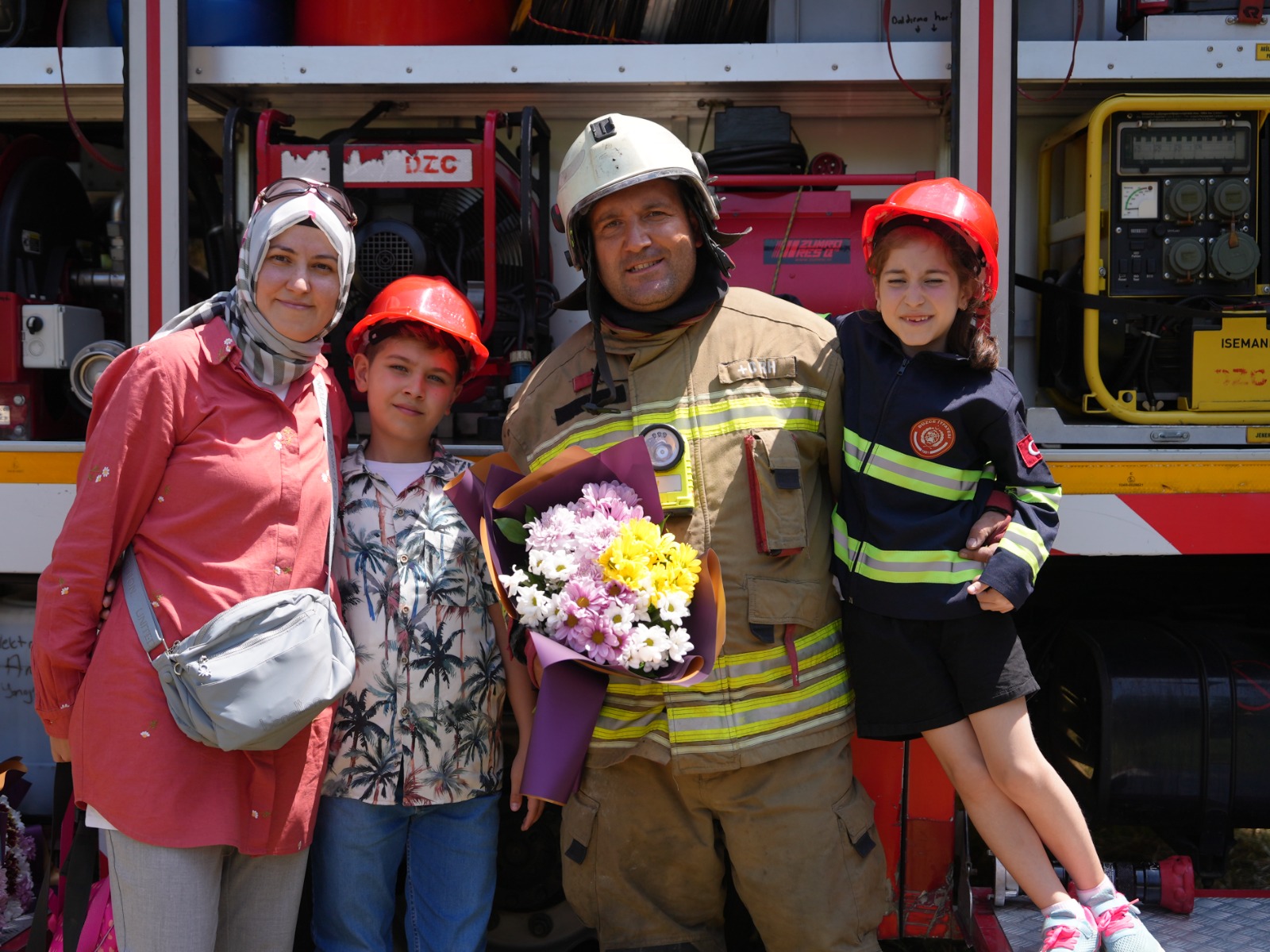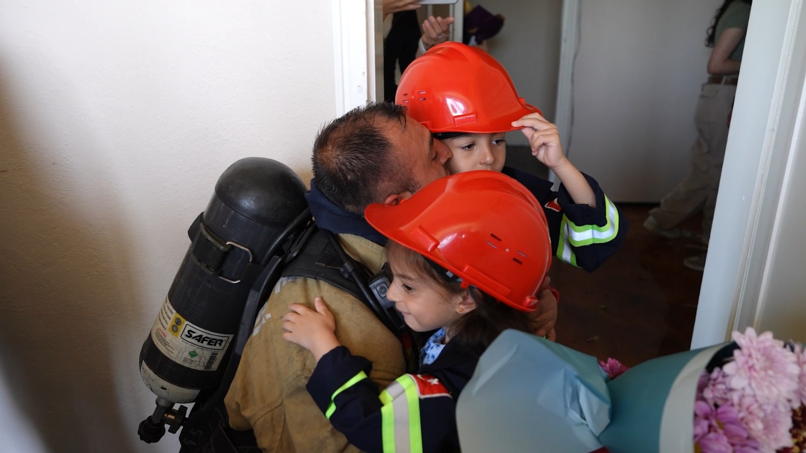 Sürpriz bununla da sınırlı kalmadı. Minik itfaiyeci kıyafetleri giyen çocuklar, ellerinde çiçeklerle babalarının yanına geldi. Babalar ve çocukların buluşması duygu dolu anlara sahne oldu.