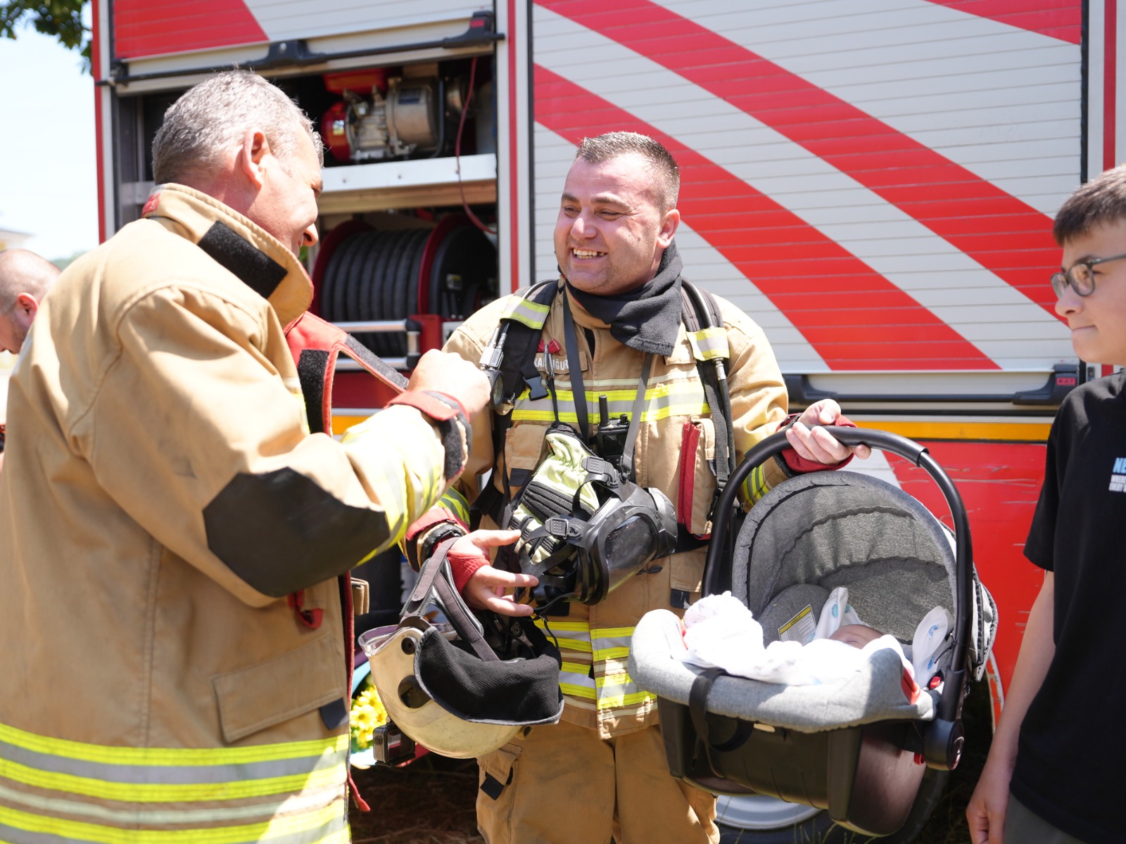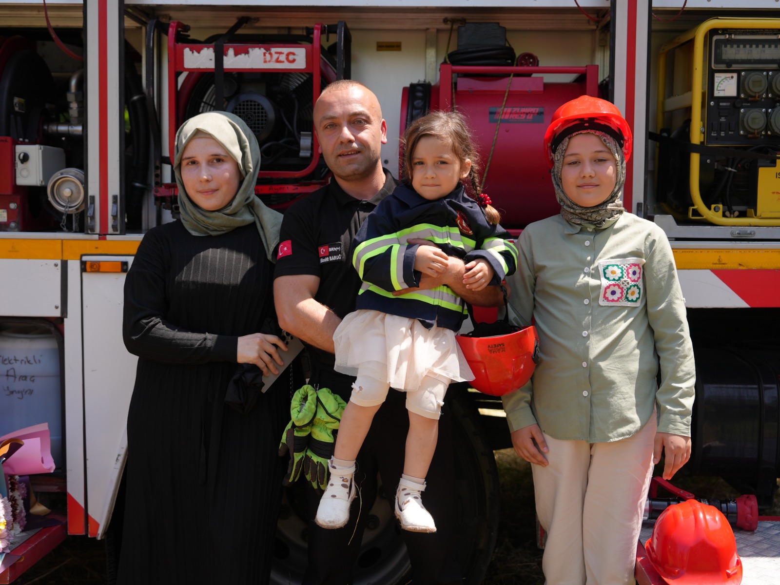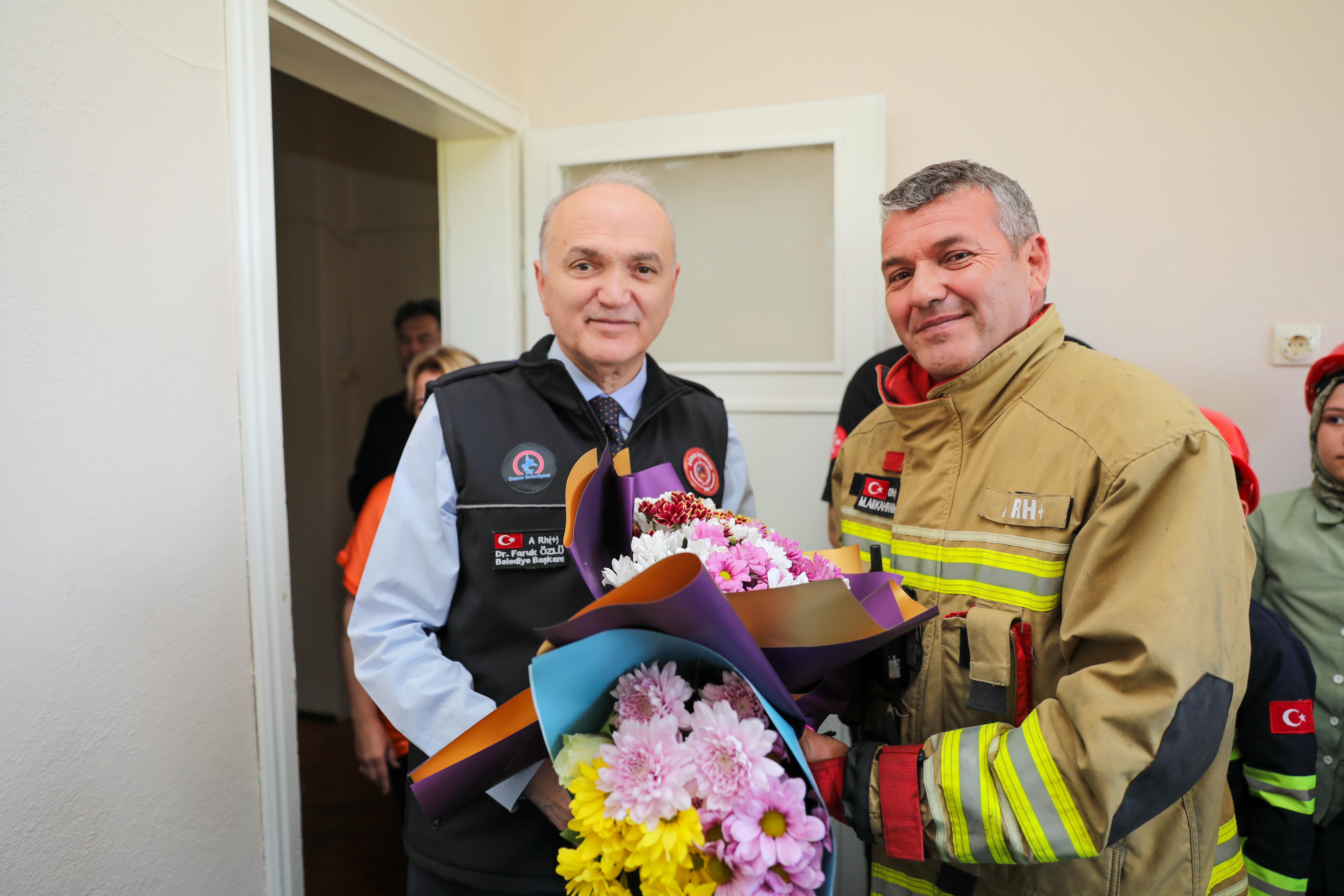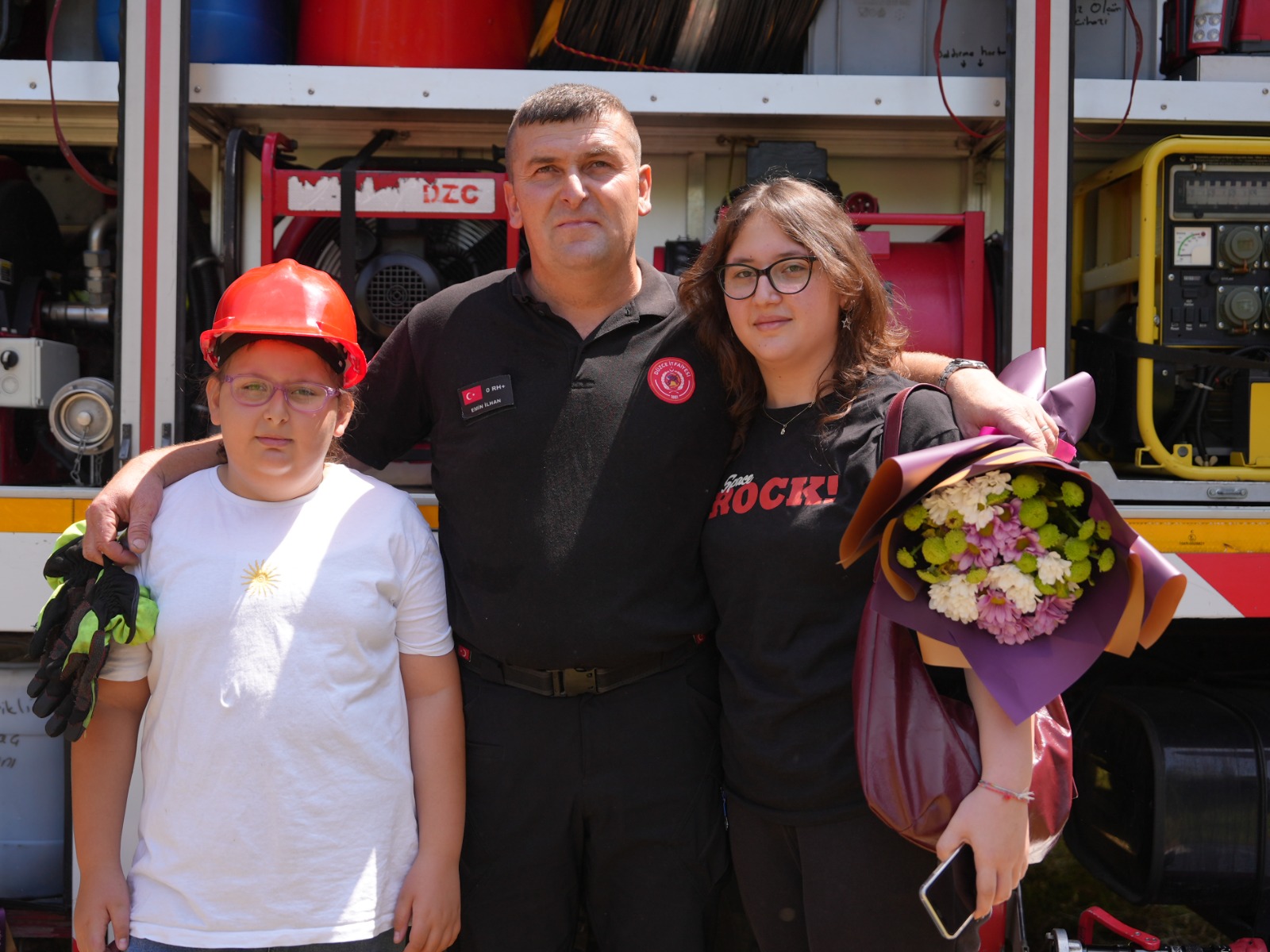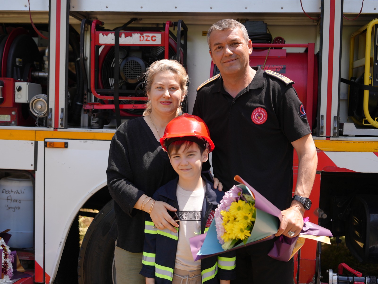 Sürpriz bununla da sınırlı kalmadı. Minik itfaiyeci kıyafetleri giyen çocuklar, ellerinde çiçeklerle babalarının yanına geldi. Babalar ve çocukların buluşması duygu dolu anlara sahne oldu.