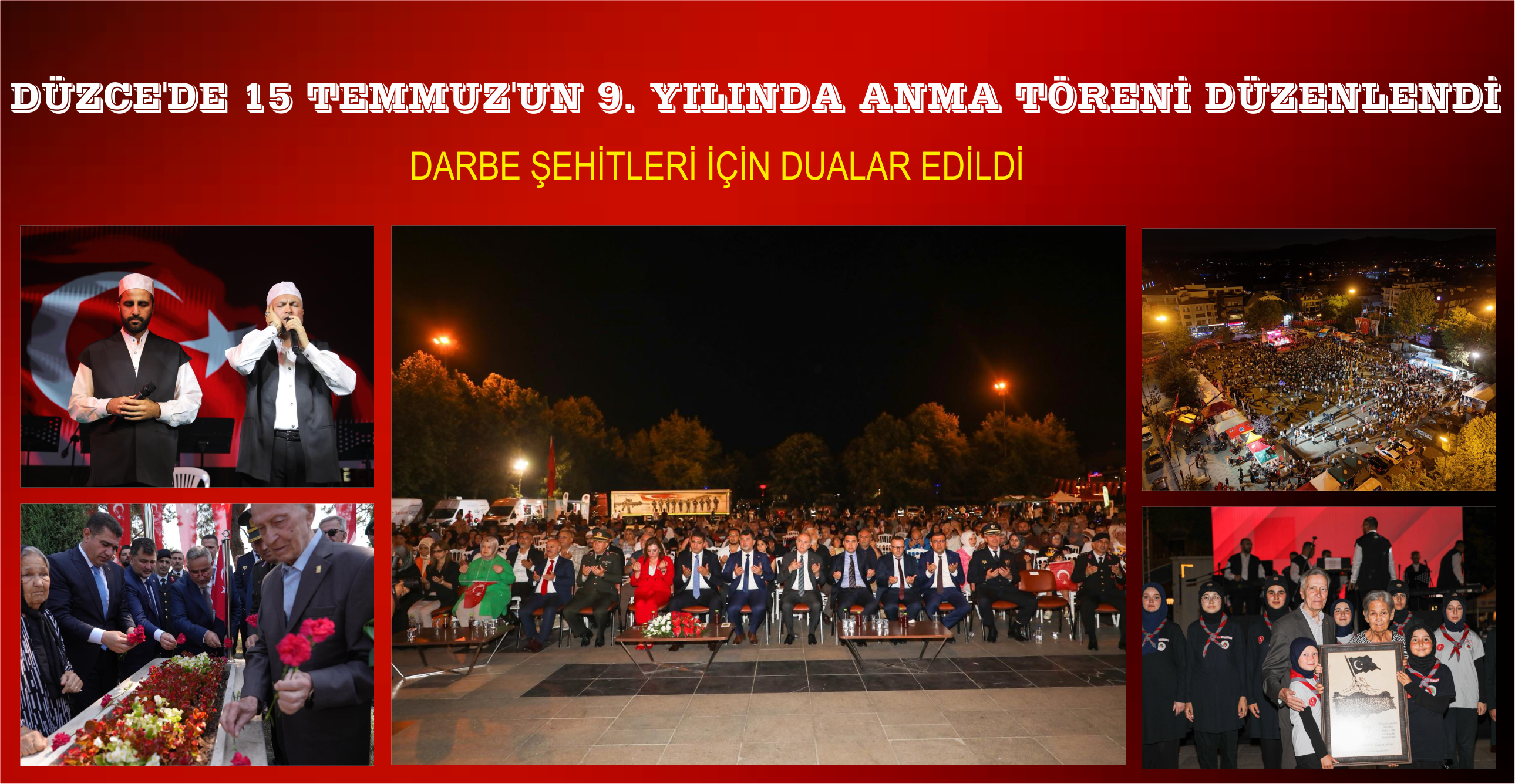 Düzce’de 15 Temmuz Demokrasi ve Millî Birlik Günü’nün 9. yıldönümü dolayısıyla çeşitli anma programları düzenlendi. Gün boyu süren etkinliklerde, başta Düzceli şehit Emniyet Müdürü Ufuk Baysan olmak üzere 15 Temmuz şehitleri dualarla anıldı. Anıtpark’ta düzenlenen anma programında duygusal anlar yaşanırken, birçok vatandaş gözyaşlarına hakim olamadı.
