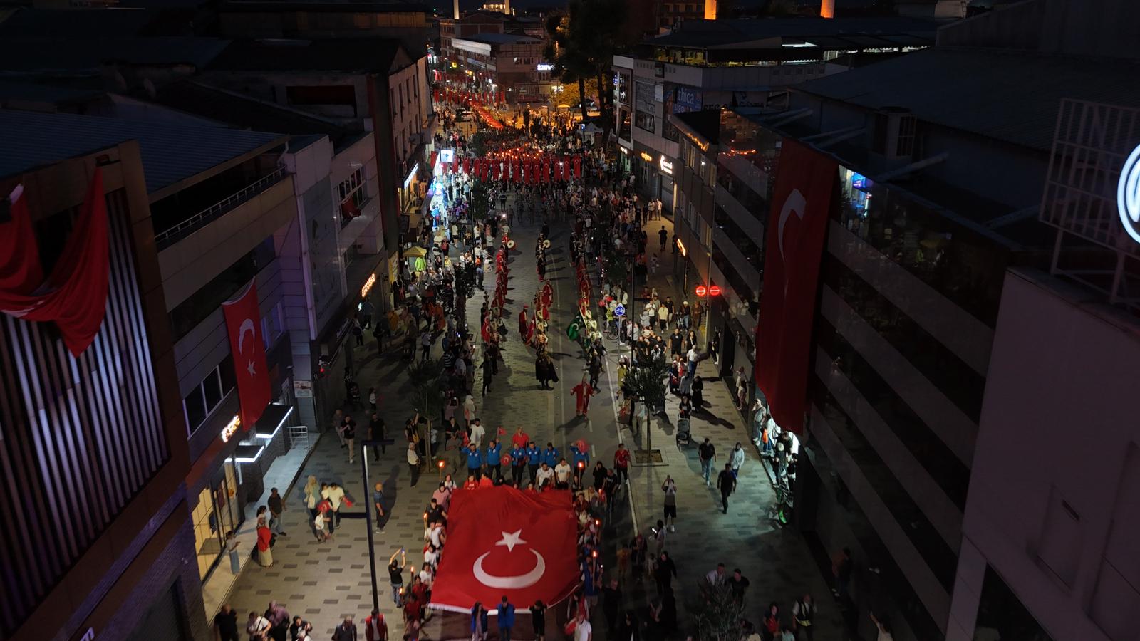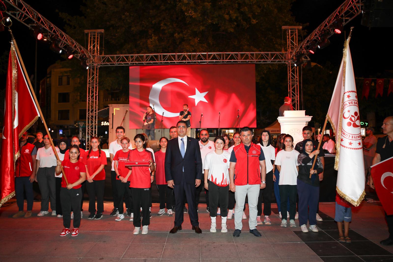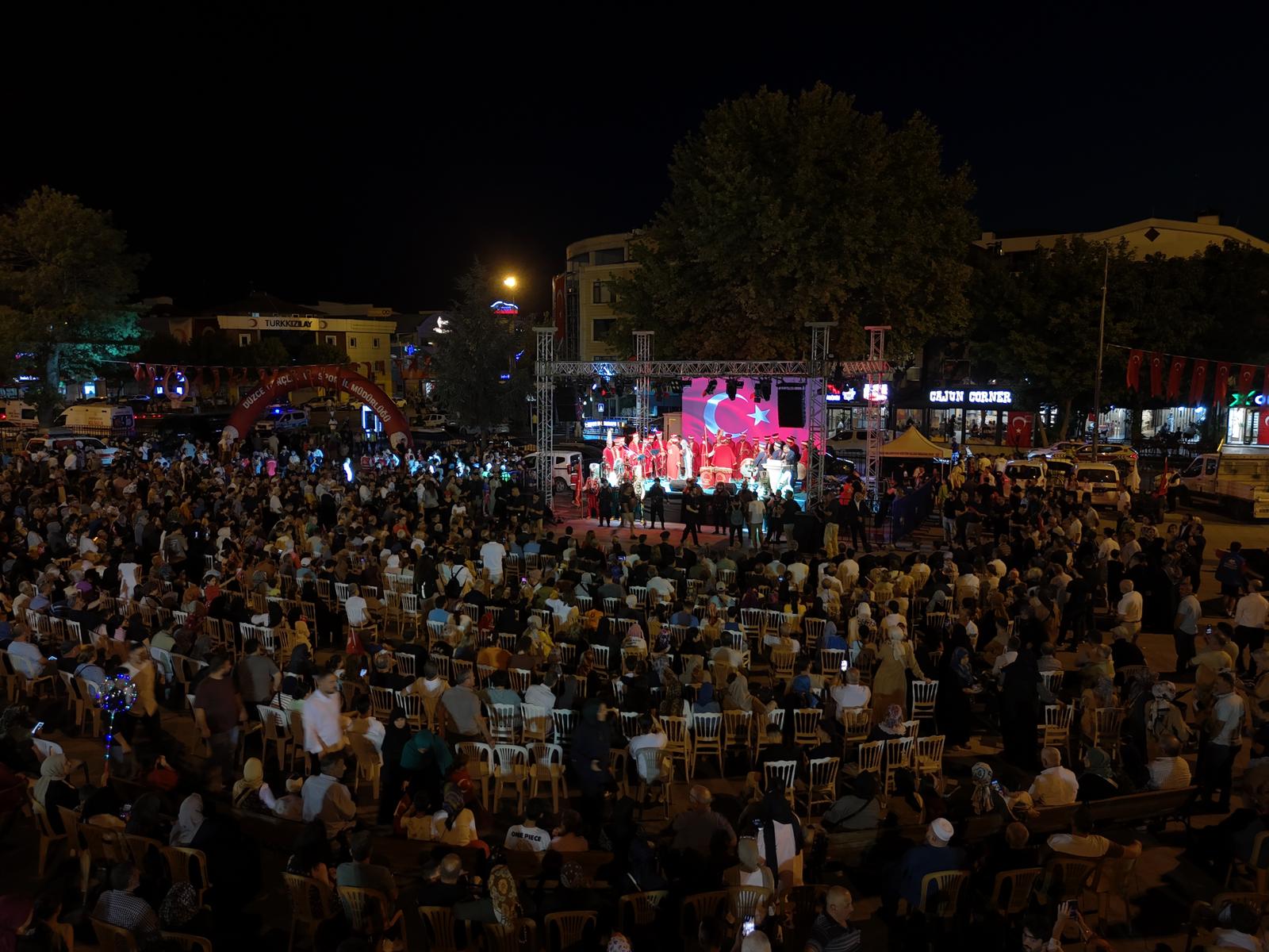 Demokrasi ve Millî Birlik Yürüyüşü, Merkez Büyük Cami önünden başlayarak mehteran takımı eşliğinde Anıtpark Meydanı’na kadar sürdü. Merkez Büyük Cami önünden başlayan yürüyüşe katılanlar, ellerinde Türk bayrakları ile mehter eşliğinde Anıtpark Meydanı’na kadar yürüdü. Anıtpark Meydanı’ndaki program, saygı duruşu ve İstiklal Marşı ile başladı. Vali Selçuk Aslan ve eşi Pınar Aslan, Düzce Belediye Başkanı Dr. Faruk Özlü, belediye başkan yardımcıları, Düzce Milletvekili Ercan Öztürk, şehit Ufuk Baysan’ın ailesi, siyasi parti ve STK temsilcileri ile çok sayıda vatandaşın katıldığı programda mehter gösterisinin ardından 15 Temmuz Demokrasi ve Millî Birlik Şehitleri Sancak Koşusu sporcuları, Türk bayrağını Vali Aslan’a teslim etti. Kur’an-ı Kerim tilaveti ile program devam etti.
