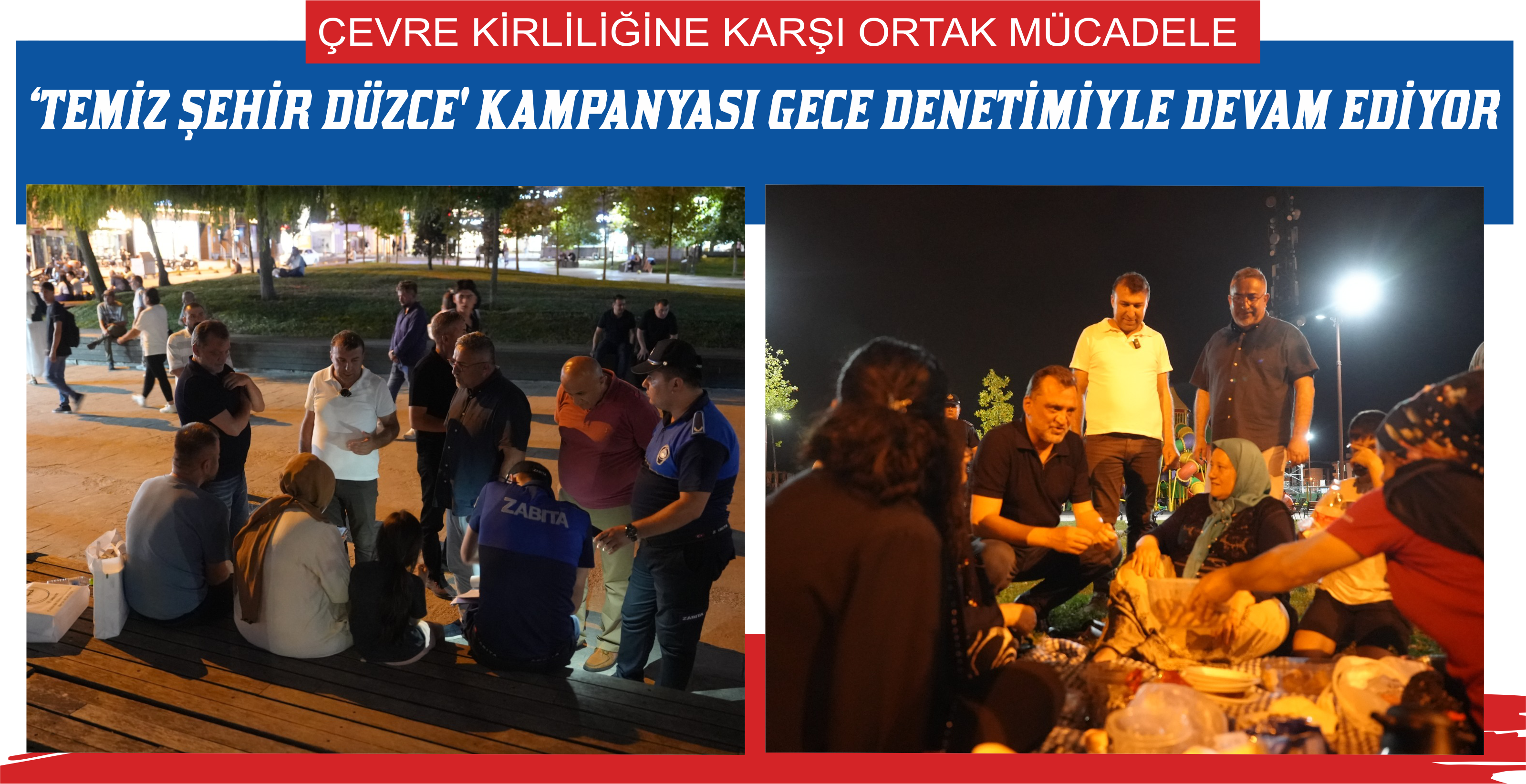 Düzce Belediyesi’nin çevre temizliği konusunda vatandaşların bilinçlenmesi ve ortak sorumluluk bilinciyle şehrin daha temiz ve yaşanabilir hale getirilmesi hedefiyle başlattığı ‘Temiz Şehir Düzce’ kampanyası kapsamında gece denetimleri yapıldı. Başkan Yardımcıları Okan Kaltu ve Mehmet Saygun, Düzce İl Emniyet Müdür Yardımcısı Aytaç Tefek, Zabıta Müdür Yardımcısı Lütfi Topar, İtfaiye Müdürü Mehmet Ali Kahraman ile Temizlik İşleri Müdürü Mehmet Emin Tangüner’in katıldığı denetimlerde, şehir merkezindeki İstanbul Caddesi, Millet Bahçesi, 23 Nisan Parkı ve Melensu Park’ta çevre temizliği ve kurallara uyum titizlikle kontrol edildi.
