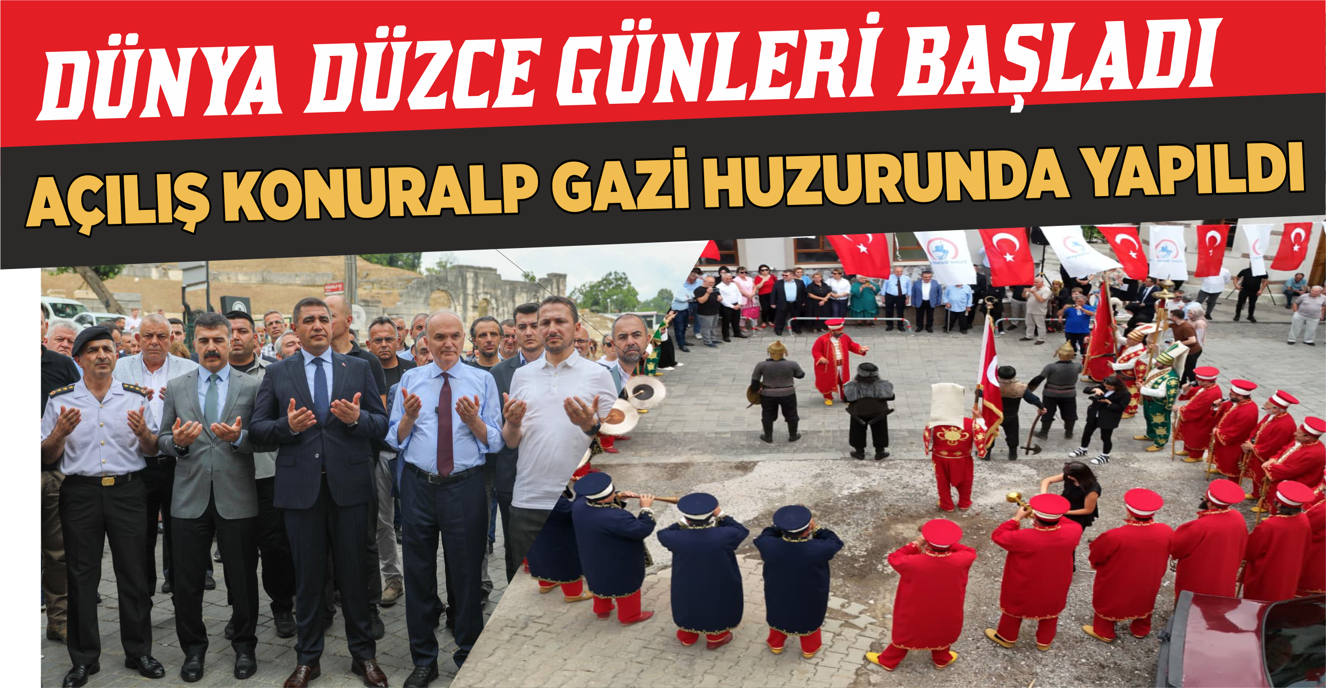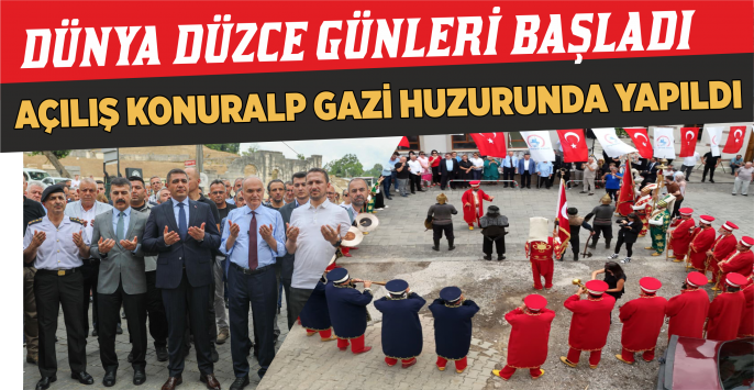 Konuralp Gazi ve silah arkadaşlarını anmak üzere Mehter Takımı’nın gösterisi ile başlayan açılış programında Düzcelilere hitap eden Düzce Valisi Selçuk Aslan Düzce’de uyumlu çalışma ortamı sayesinde kültürel kimliğin geliştiğini belirterek şunları söyledi: “Dünya Düzce Günleri’nin dördüncüsünde bugün bir aradayız. Bu güzide günü çok doğru bir yerden başlatıyoruz. Konuralp Gazi’nin huzurundayız, 1323 yılından bu yana Düzce bizim diyoruz. Cumhuriyetimizin en genç vilayeti; gençliği, dinamizmi ve asaleti hepsi iç içe. Osmanlı üç kıtada hüküm süren önceki devletimiz. Düzce’nin şöyle bir özelliği var; Osmanlı sancağının dalgalandığı her yerden gelen insanlara vatan olmuştur. Renkli bir sosyolojimiz var, farklı diyarlardan gelmiş insanlarız ancak doyduğumuz yer memleketimiz ise orası Düzce, ortak kimliğimiz de Düzcelilik. Sosyal bütünleşme kavramına baktığımız zaman, insanların kendi isteğiyle kendini bir toprak parçasına ait hissetmesidir. Dünya Düzce Günleri gibi etkinlikler bu aidiyeti destekleyecektir. Düzce’miz eline aldığı her sektörde var ve başarılı. Endüstride, tarımda, turizmde her yerde varız. Düzce bir kültür kenti olma yolunda ilerliyor. İnsanlık tarihi bir bütün, önceki yaşayanlardan tecrübe ediyor ve devam ediyoruz. Allah Konuralp Gazi’den ve askerlerinden razı olsun. Dünya Düzce Günleri kutlu olsun, gelecek günlerde hep birlikte kutlamak dileğiyle”