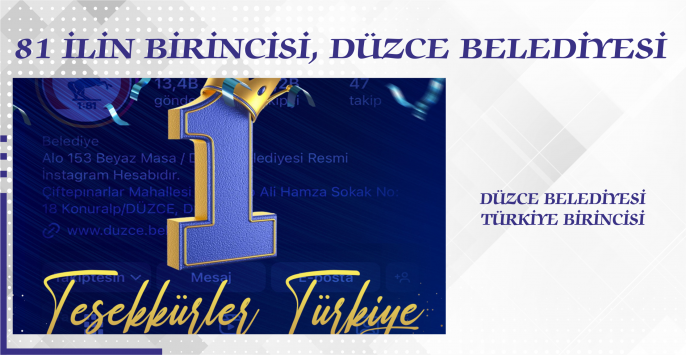 Daha önce kendi ölçeğindeki 51 il arasında defalarca sosyal medya birincisi olan Düzce Belediyesi, bu kez 81 il arasında Türkiye birincisi oldu. Boomsocial tarafından her ay hazırlanan "Sosyal Medya Kullanım Performans Analizi" raporuna göre, Düzce Belediyesi Temmuz ayında 81 il belediyesi arasından en çok etkileşim alan belediye olarak açık ara farkla zirvede yer aldı.