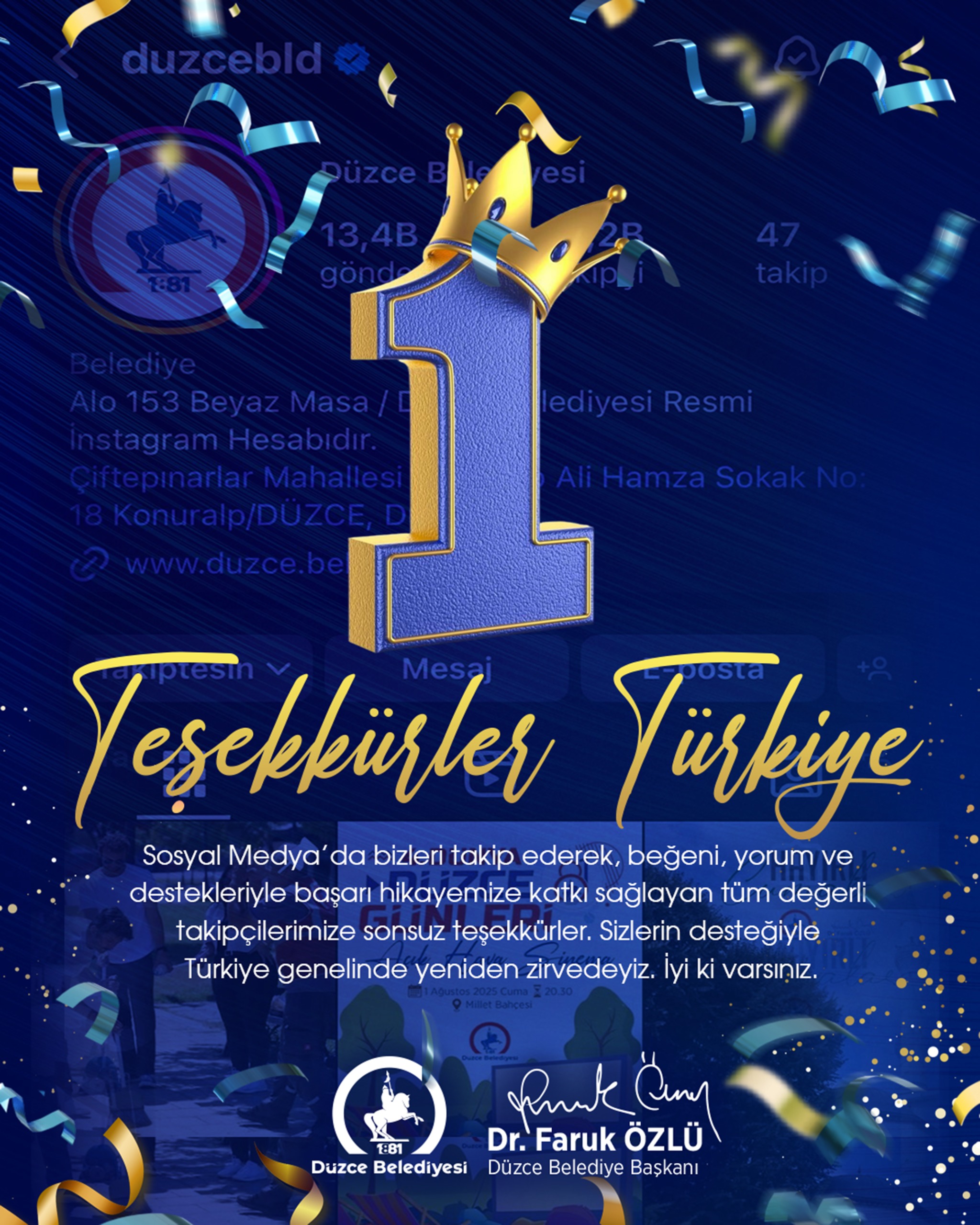 Boomsocial sosyal medya analiz şirketi tarafından 2025 Temmuz ayı paylaşımları baz alınarak hazırlanan "Sosyal Medya Kullanım Performans Analizi" raporuna göre Düzce Belediyesi, Büyükşehir Belediyelerinin de yer aldığı 81 il belediyesi arasında Türkiye birincisi oldu. Basın Yayın ve Halkla İlişkiler Müdürlüğü'nün yönettiği sosyal medya hesaplarından yapılan paylaşımlar, Temmuz ayında da tıklanma ve beğenme rekorları kırdı.