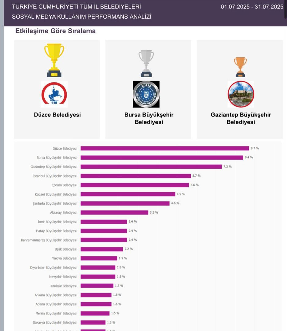 Rapora göre Düzce Belediyesi Facebook paylaşımları bir ay boyunca toplam 78 bin 226, İnstagram gönderileri 363 bin 107, X paylaşımları ise 4 bin 125 etkileşim alarak üç platformun ortalamasına göre Temmuz ayını birinci kapattı. Düzce Belediyesinin en fazla etkileşim alan paylaşımı ise İnstagram platformunda, 254 bin beğeni ve 4 milyon sayısı ile çevre temizliği ile ilgili videosu oldu.