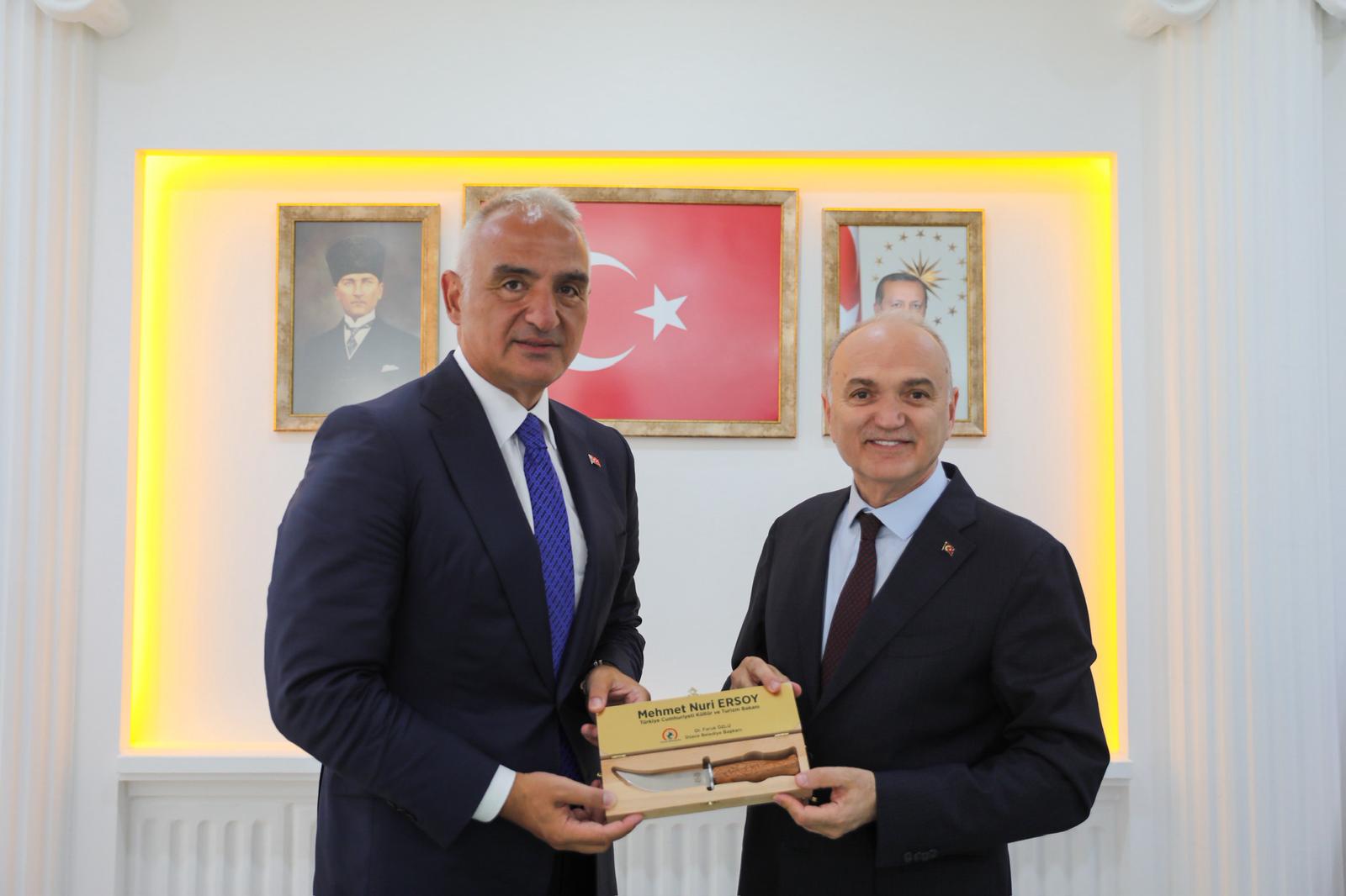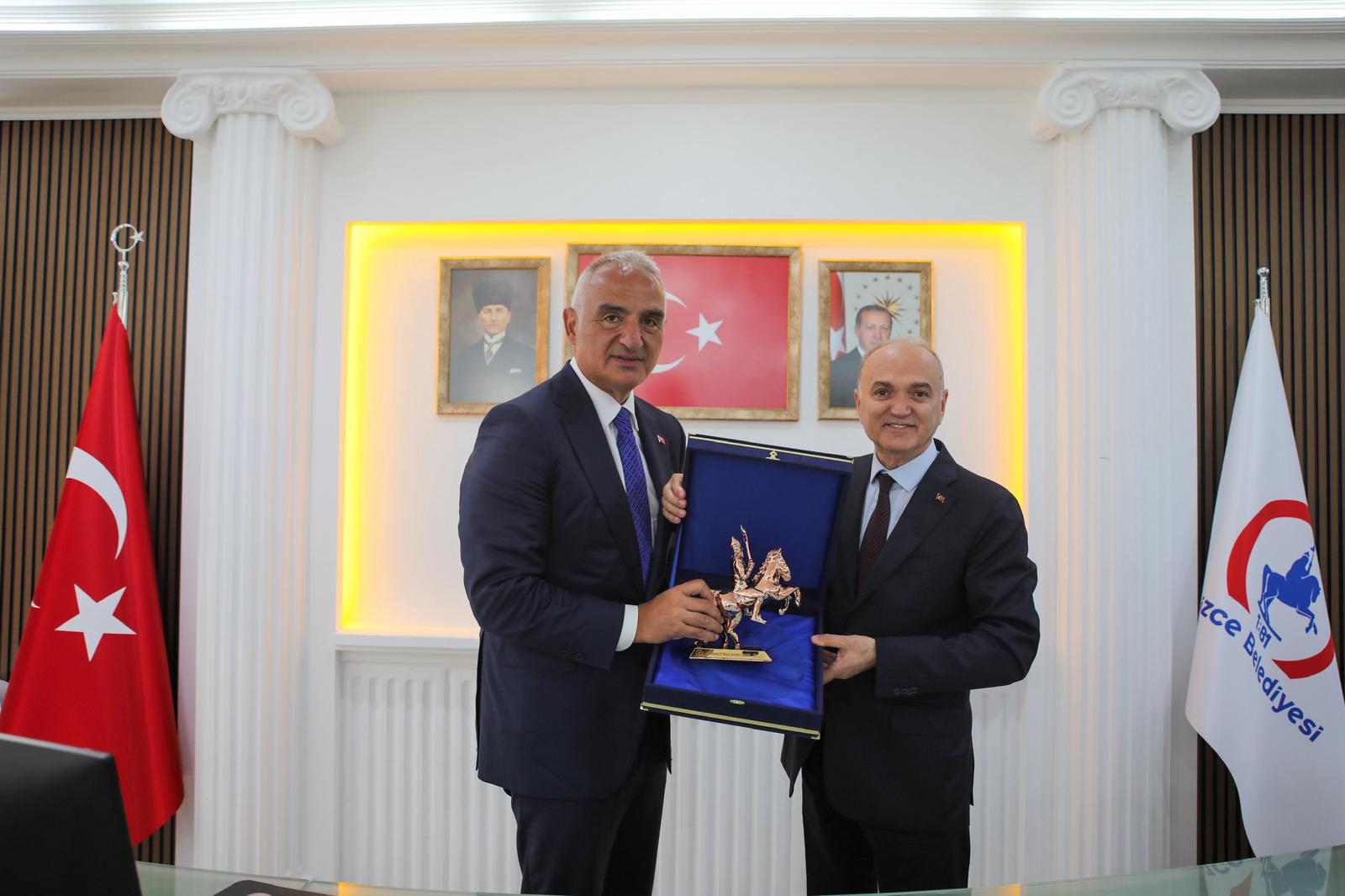 Kültür ve Turizm Bakanı Mehmet Nuri Ersoy Düzce ziyaretleri kapsamında ilk olarak Düzce Belediye Başkanı Dr. Faruk Özlü’nün ev sahipliğinde düzenlenen toplantıya katıldı. Düzce Valisi Selçuk Aslan ile kurum müdürlerinin de bulunduğu toplantıda Düzce’de yürütülen kültür ve turizm yatırımları ve projeler Bakan Ersoy’a sunuldu. Özellikle Konuralp Antik Tiyatro’da tamamlanmak üzere olan kazıların ardından başlayacak restorasyon çalışmalarının değerlendirildiği toplantının ardından heyet Antik Tiyatro’yu gezdi.