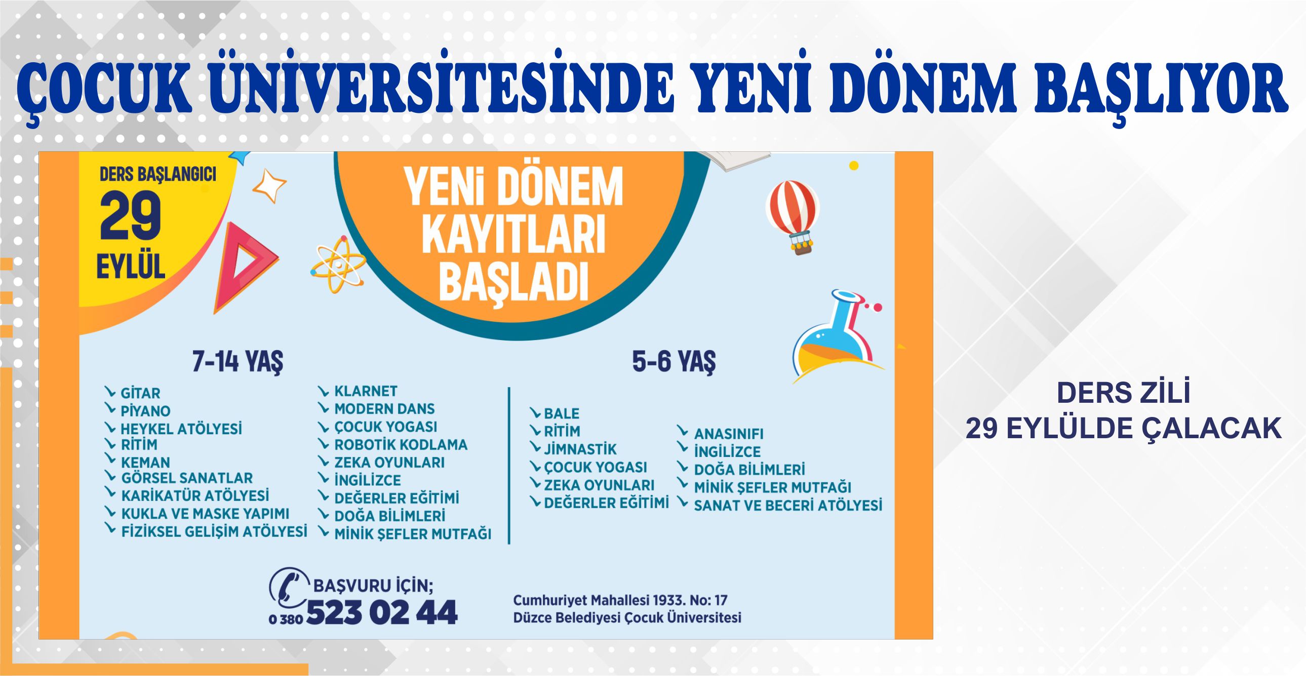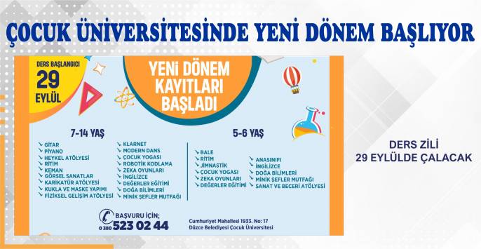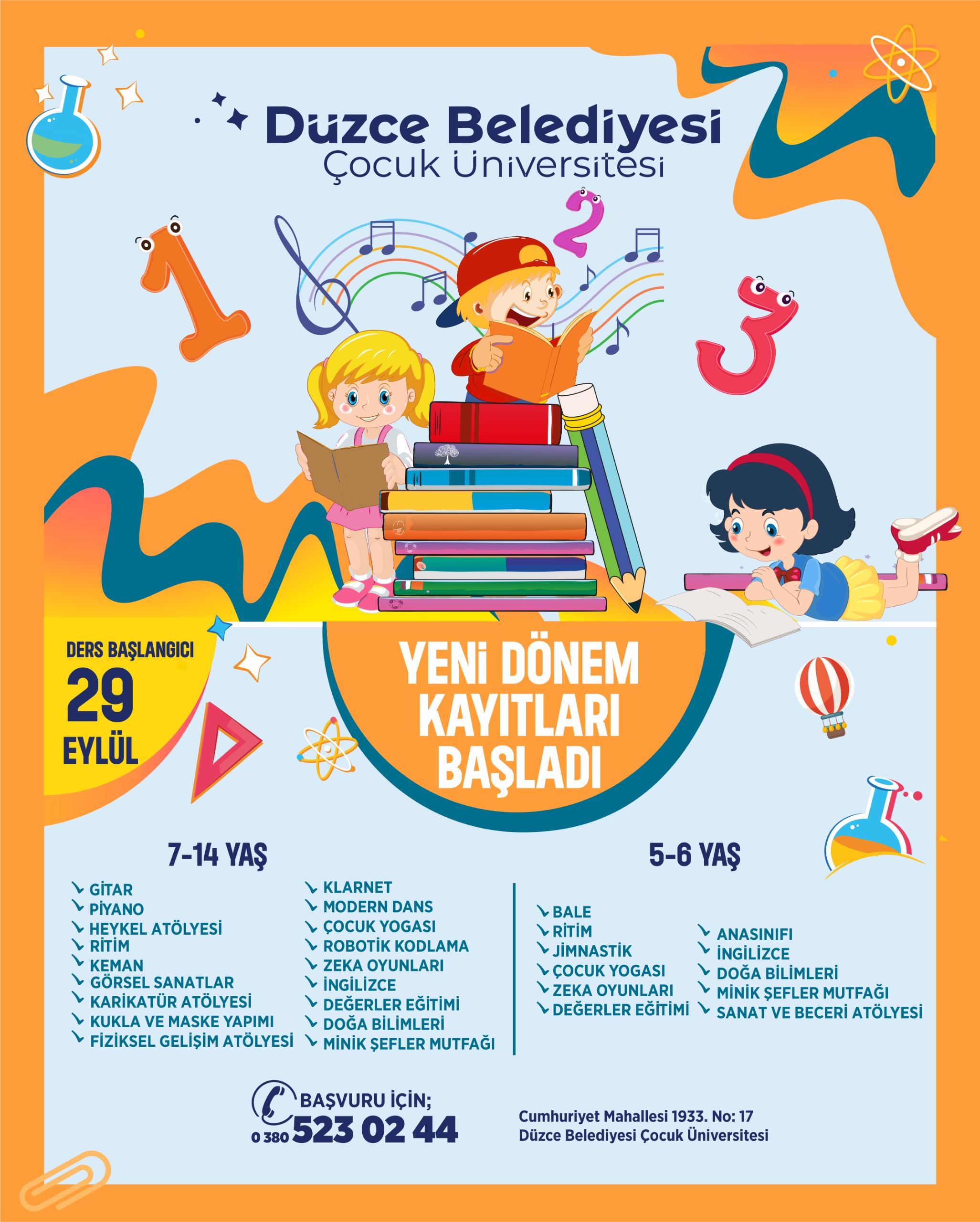 Düzce Belediyesi Çocuk Üniversitesi yoğun yaz döneminin ardından 2025-2026 eğitim öğretim yılı ilk dönem kayıtlarını almaya başladı. 5 yaştan 14 yaşa kadar farklı 29 branşta düzenlenecek eğitimler 29 Eylül 2025 Pazartesi günü başlayacak.
