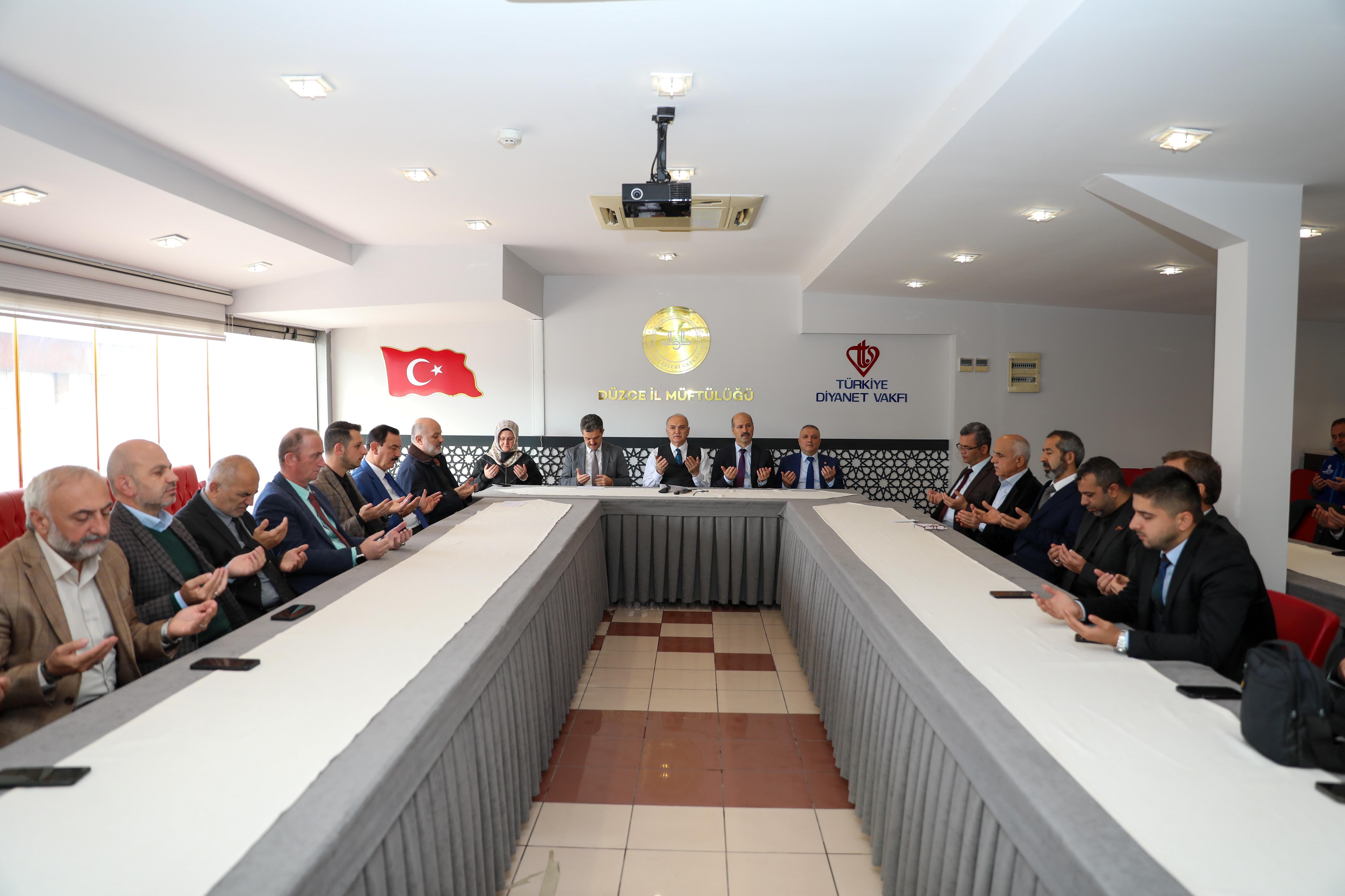 İl Müftüsü Osman Aydın ziyaretten duyduğu memnuniyeti dile getirerek, “Camiler ve Din Görevlileri Haftası vesilesiyle bizleri ziyaret eden Sayın Başkanımıza teşekkür ediyoruz. Her Cuma olduğu gibi bugün de okunmuş olan hatmi şeriflerin duasını yaptık” ifadelerini kullandı.