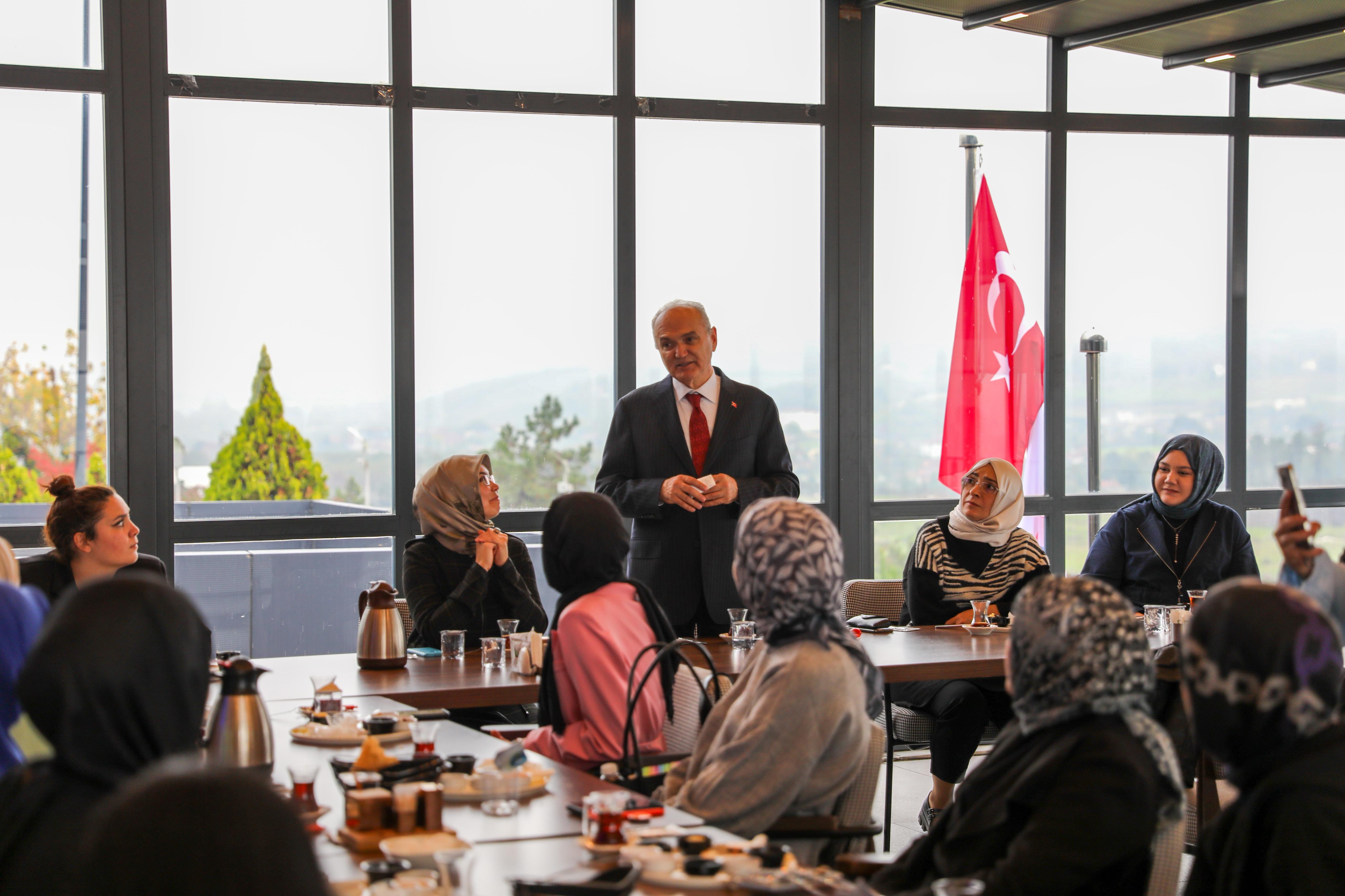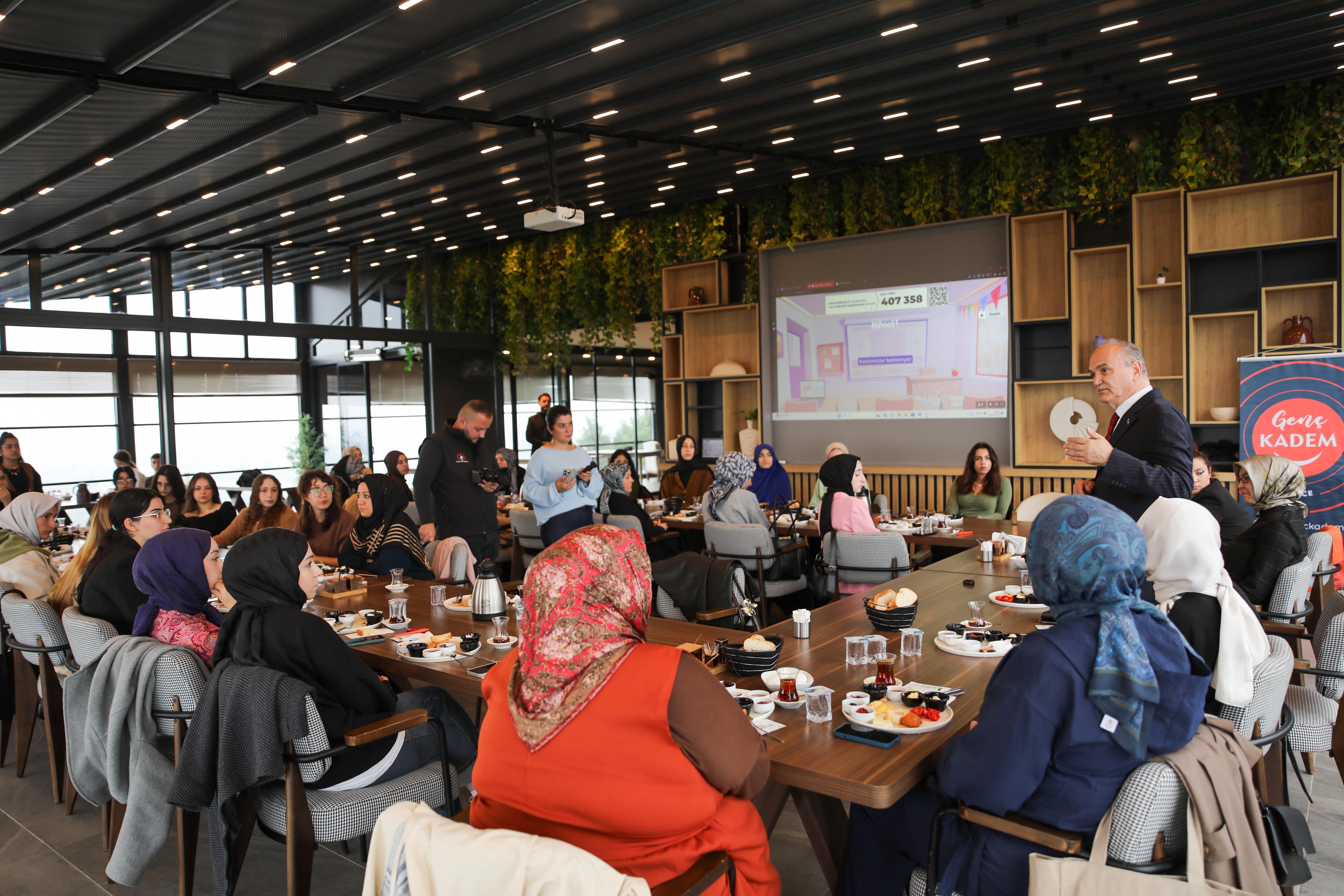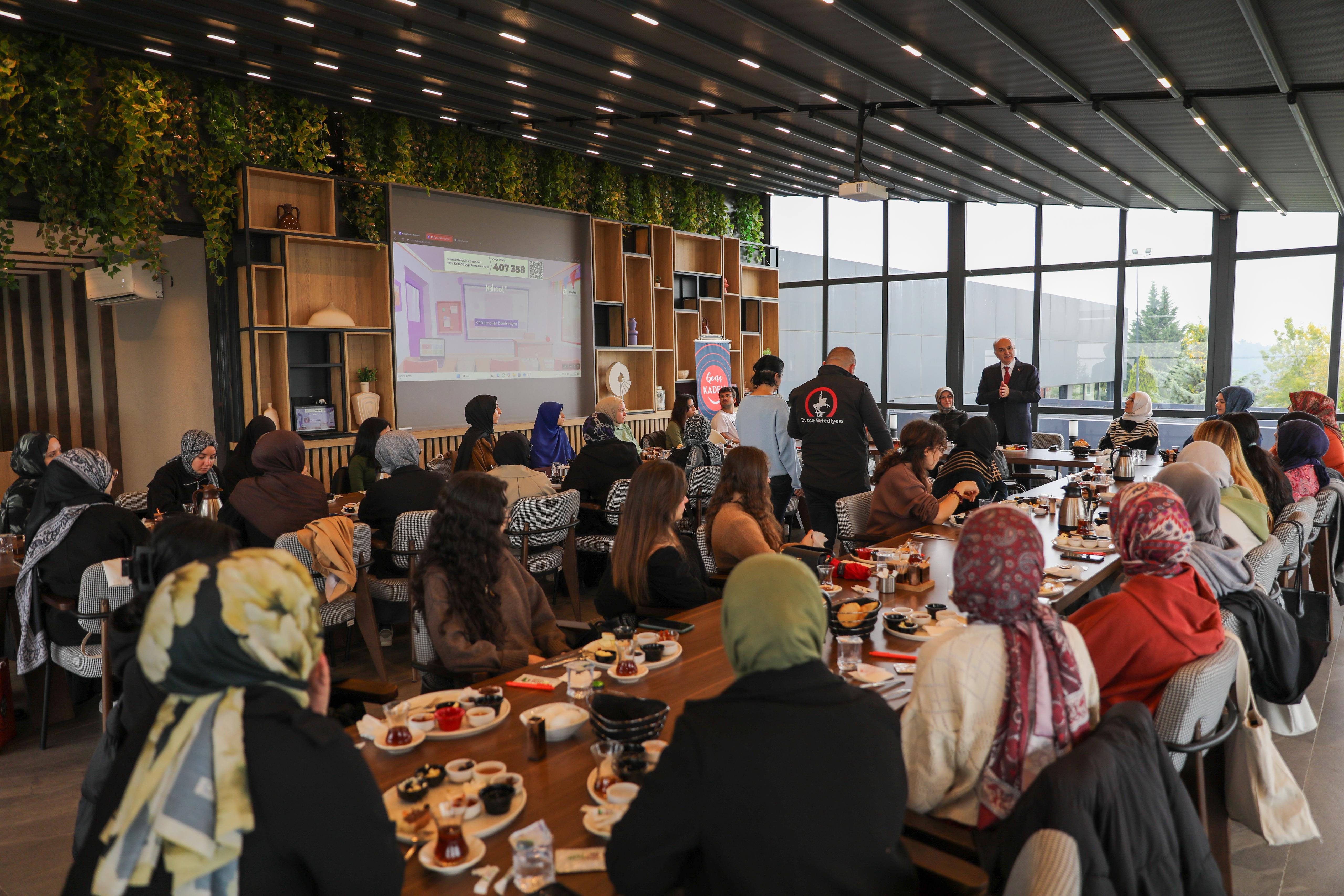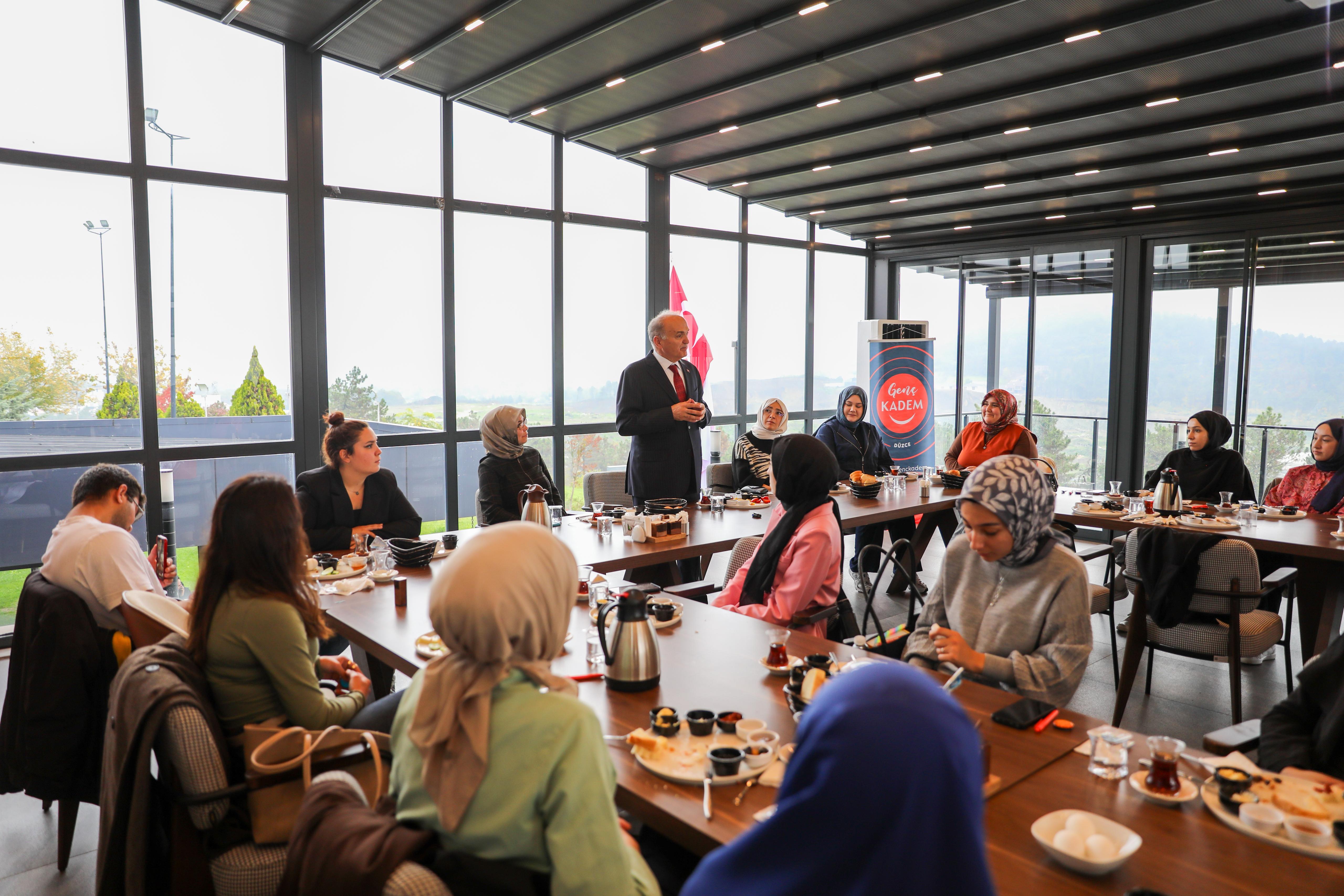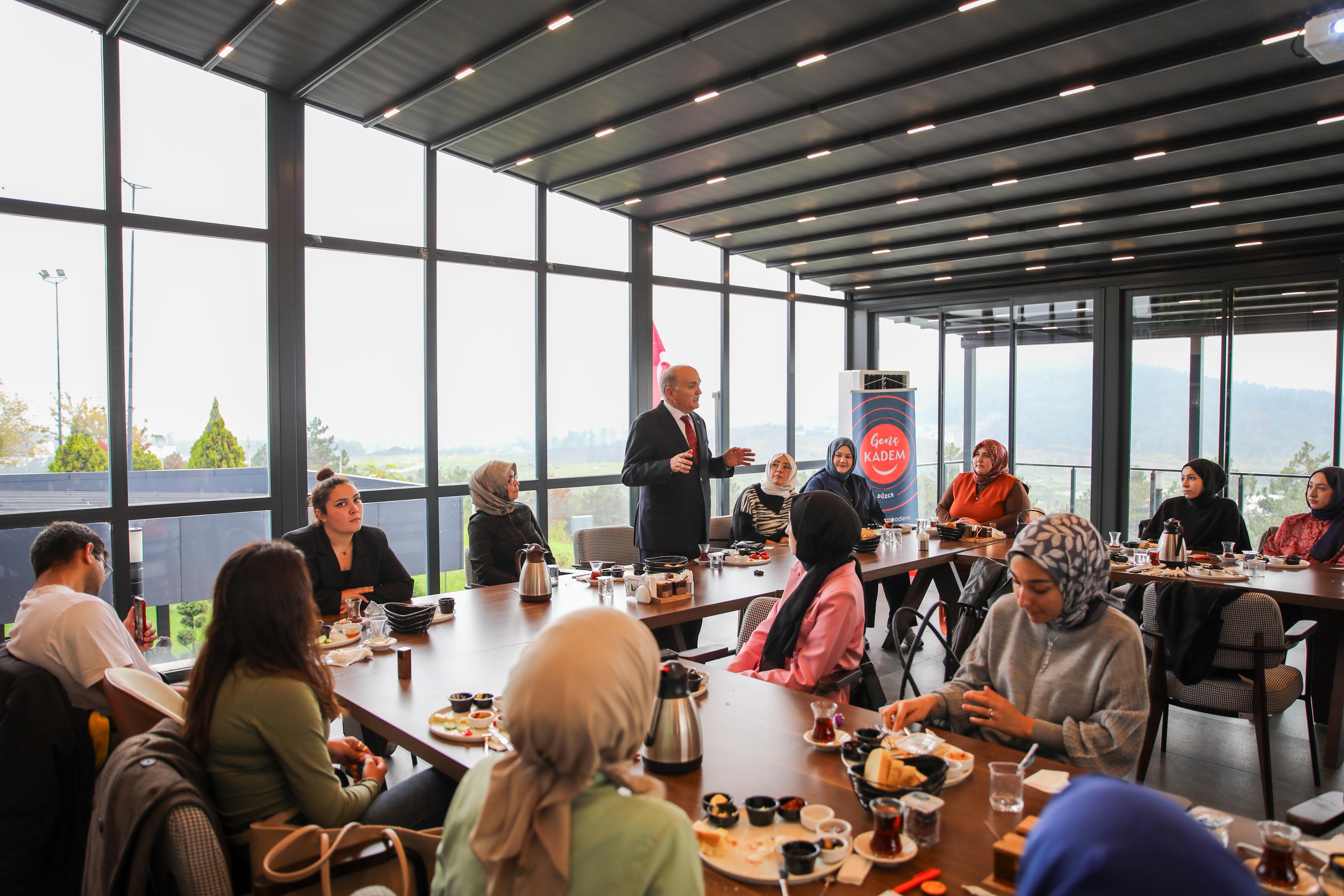 Mutfak Sanatları Merkezi’nde Düzce Üniversitesi Genç KADEM Topluluğu tarafından düzenlenen ve KADEM Düzce İl Temsilcisi Dr. Fatma Kızılelmas, Düzce Genç KADEM İl Sorumlusu Sude Naz Geçici ile Düzce Üniversitesi Genç KADEM Topluluğu Başkanı Berra Özel'in de hazır bulunduğu tanışma kahvaltısına katılım sağlayan Başkan Özlü, öğrencilerle bir araya geldi.
