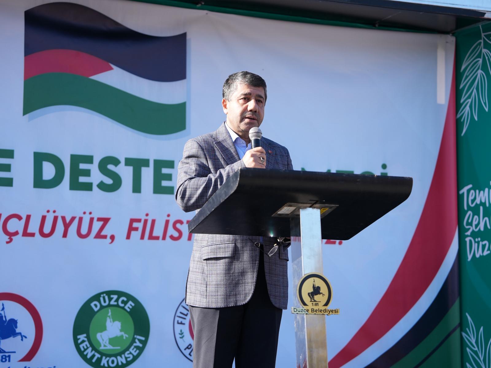 Filistine Destek Platformu adına konuşan İHH Düzce İl Başkanı Onur Okşit; “İnsanlık, insanlık tarihi boyunca yüzlerce, binlerce zulme şahitlik yaptı, tarih zalimlerin mazlumlara yaptığı zulümlerle dolu. Ancak belki de son 100 yılın en büyük zulümlerden birini mazlum Filistin halkı yaklaşık yüzyıldan fazladır yaşamakta. Belki de Filistin halkının yaşadığı zulmün en şiddetlisi, en acımasızına maalesef tüm dünya halkları gibi bizler de son 2 yılda hep birlikte şahit olmaktayız.