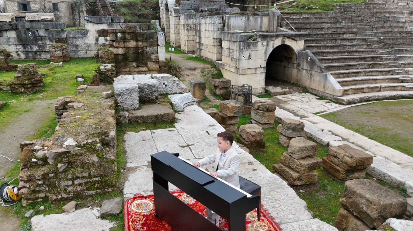 Konuralp’te antik taş duvarların arasında yankılanan piyano ezgileri, tarih ile müziğin etkileyici buluşmasına sahne oldu. Düzce Belediyesi Basın Yayın ve Halkla İlişkiler Müdürlüğü’nün gerçekleştirdiği özel çekimde; 6 yaşındaki Mehmed Selim Biçer, tarihi Milattan Önce 3. Yüzyıl’a dayanan Konuralp Antik Tiyatrosu’nda piyano performansı sergiledi. Türk Marşı, Nazende Sevgilim, Tuna Dalgaları, Passacaglia ve Field eserlerini başarıyla icra eden Biçer, küçük yaşına rağmen eserlere olan hâkimiyetiyle dikkat çekti.