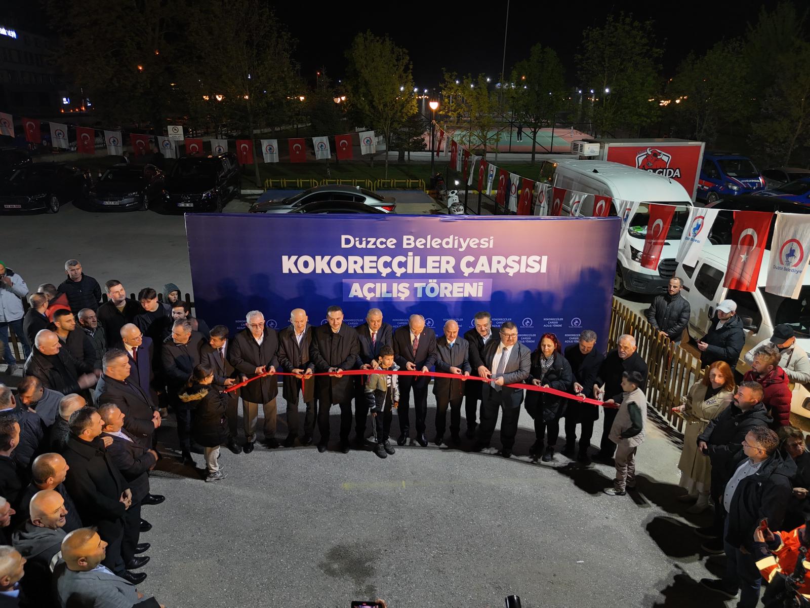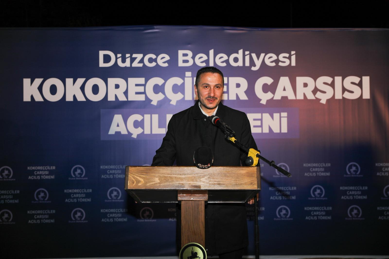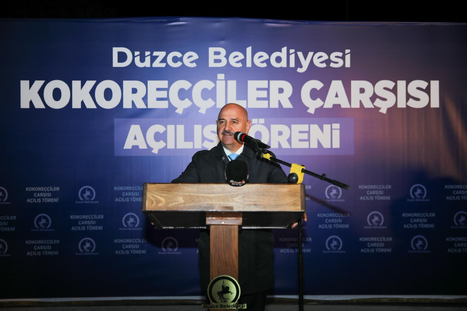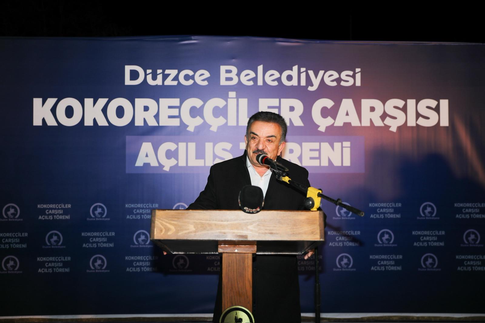 Törende konuşan Belediye Başkanı Dr. Faruk Özlü, kokoreççilerin daha önce Asar Deresi kenarında, fiziki koşulları yetersiz bir alanda hizmet verdiğini hatırlatarak, “Orası derme-çatma bir yerdi. Hijyen sorunları vardı, tuvalet ihtiyacı dahi tam anlamıyla karşılanamıyordu. Burayı taşımamız gerekiyordu. Burası gerçekten Düzce’nin merkezine makul mesafede olan bir yer. Belki de ilk defa bir gece açılışı yapıyoruz. Çünkü burası Kokoreççiler Çarşısı. Ben bu vesile ile bazı arkadaşlara teşekkür etmek istiyorum. Sayın Mehmet Habiboğlu’nun ve Nurhan Kartal’ın. Milli Emlak’ın yerinde bu tesisleri inşa ettik. Bu binaların yapımına katkı sağlayan arkadaşlarımıza teşekkür ediyorum. Düzce’mize hayırlı uğurlu olmasını diliyorum” dedi.