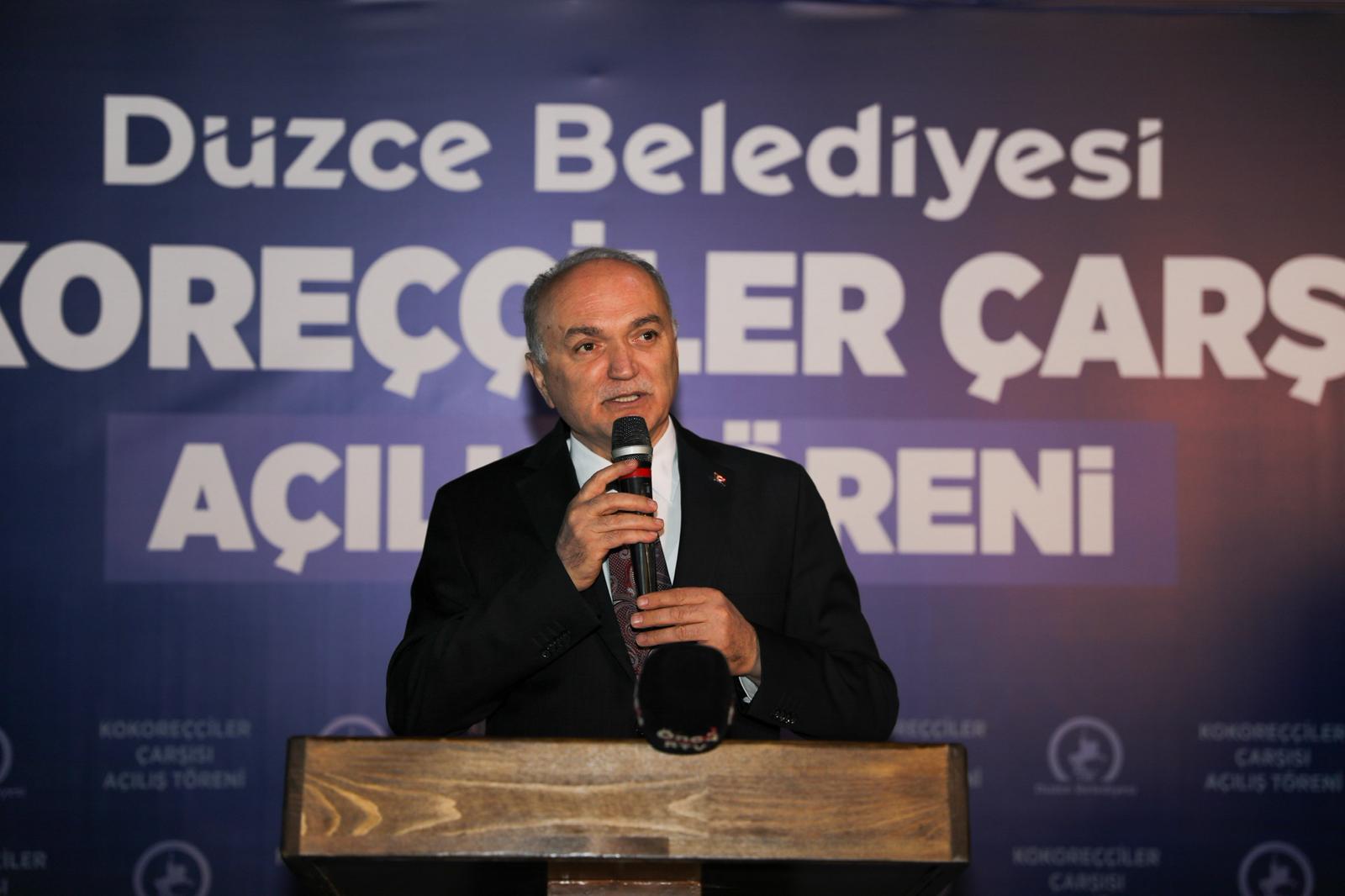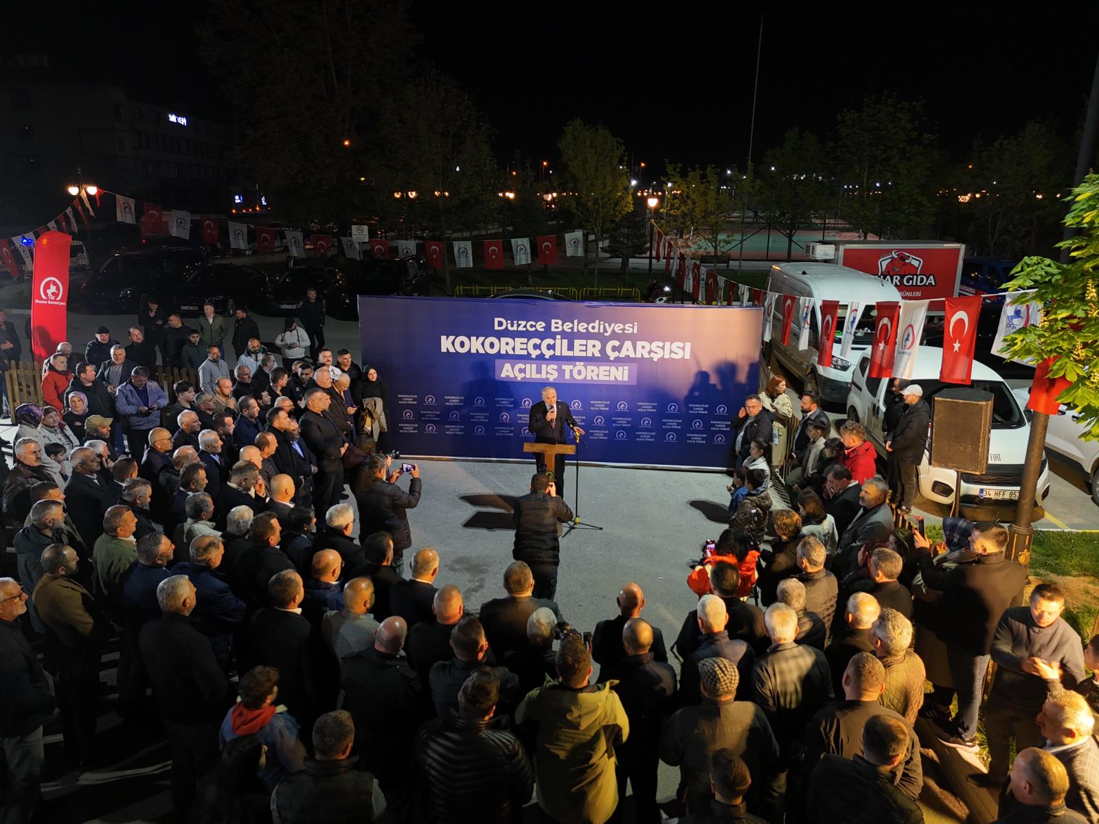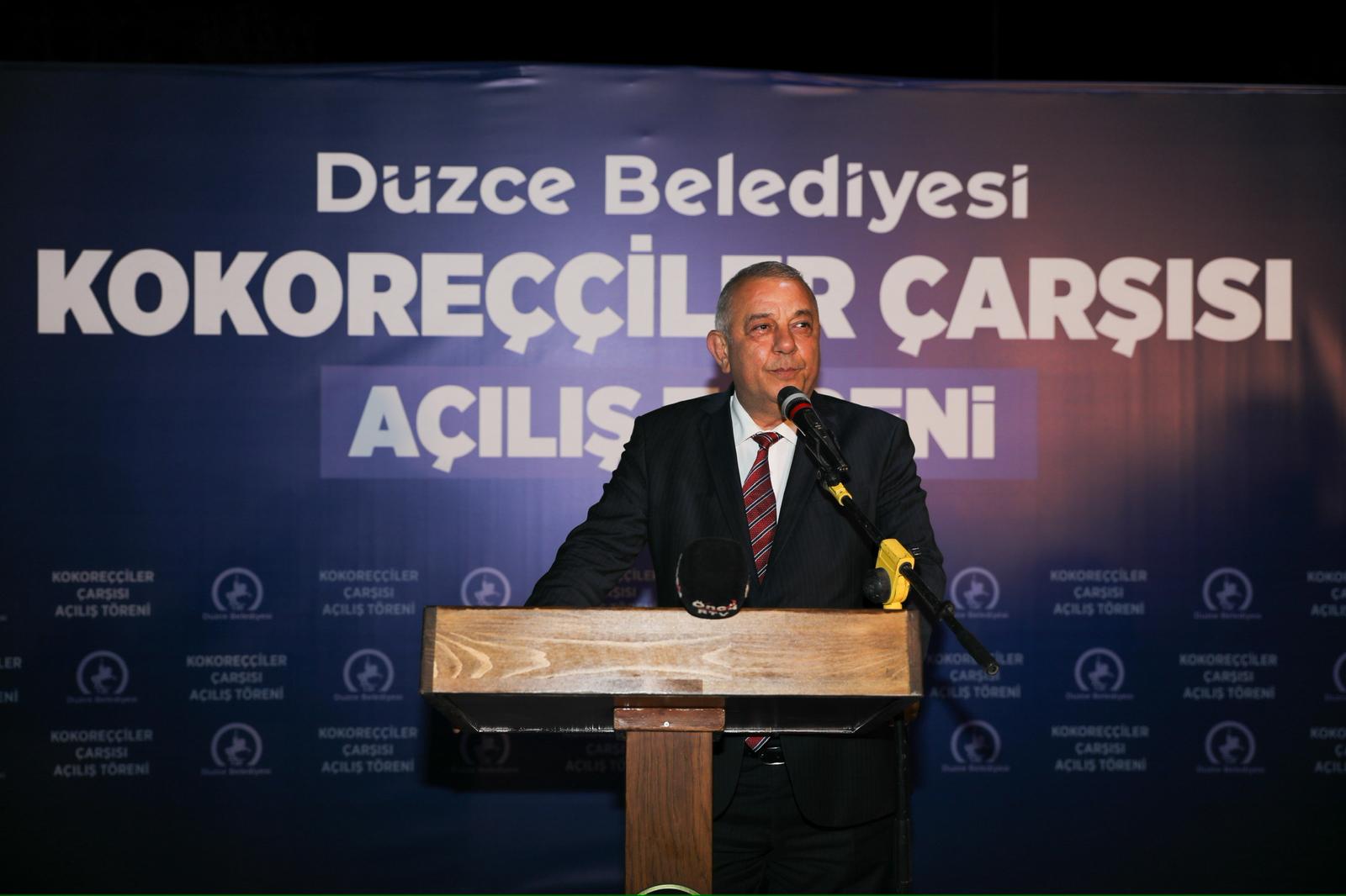 Törende konuşan Belediye Başkanı Dr. Faruk Özlü, kokoreççilerin daha önce Asar Deresi kenarında, fiziki koşulları yetersiz bir alanda hizmet verdiğini hatırlatarak, “Orası derme-çatma bir yerdi. Hijyen sorunları vardı, tuvalet ihtiyacı dahi tam anlamıyla karşılanamıyordu. Burayı taşımamız gerekiyordu. Burası gerçekten Düzce’nin merkezine makul mesafede olan bir yer. Belki de ilk defa bir gece açılışı yapıyoruz. Çünkü burası Kokoreççiler Çarşısı. Ben bu vesile ile bazı arkadaşlara teşekkür etmek istiyorum. Sayın Mehmet Habiboğlu’nun ve Nurhan Kartal’ın. Milli Emlak’ın yerinde bu tesisleri inşa ettik. Bu binaların yapımına katkı sağlayan arkadaşlarımıza teşekkür ediyorum. Düzce’mize hayırlı uğurlu olmasını diliyorum” dedi.