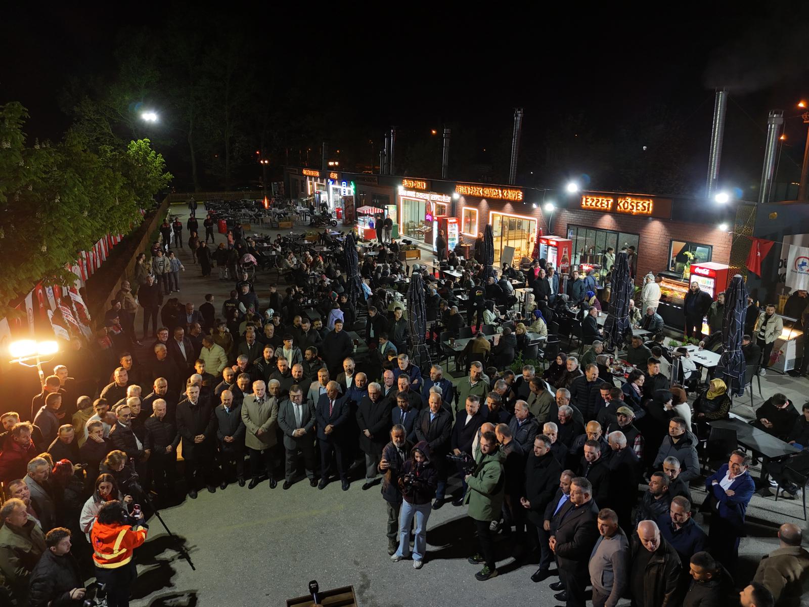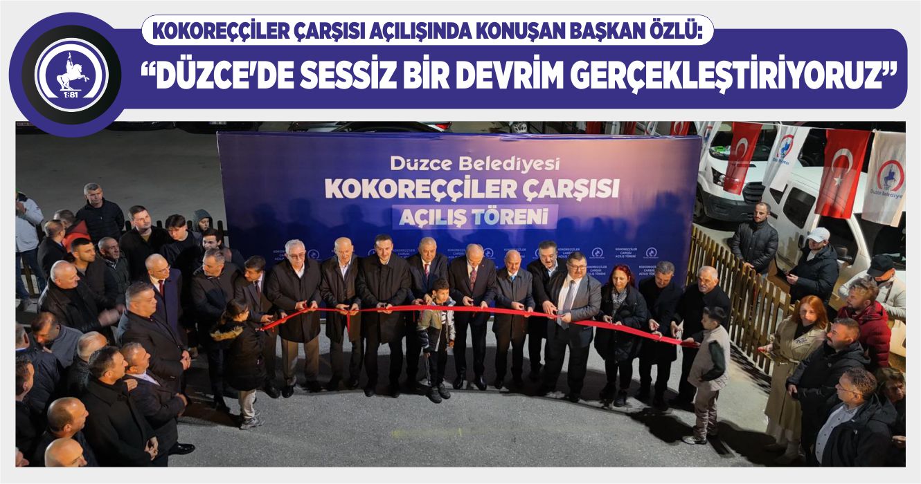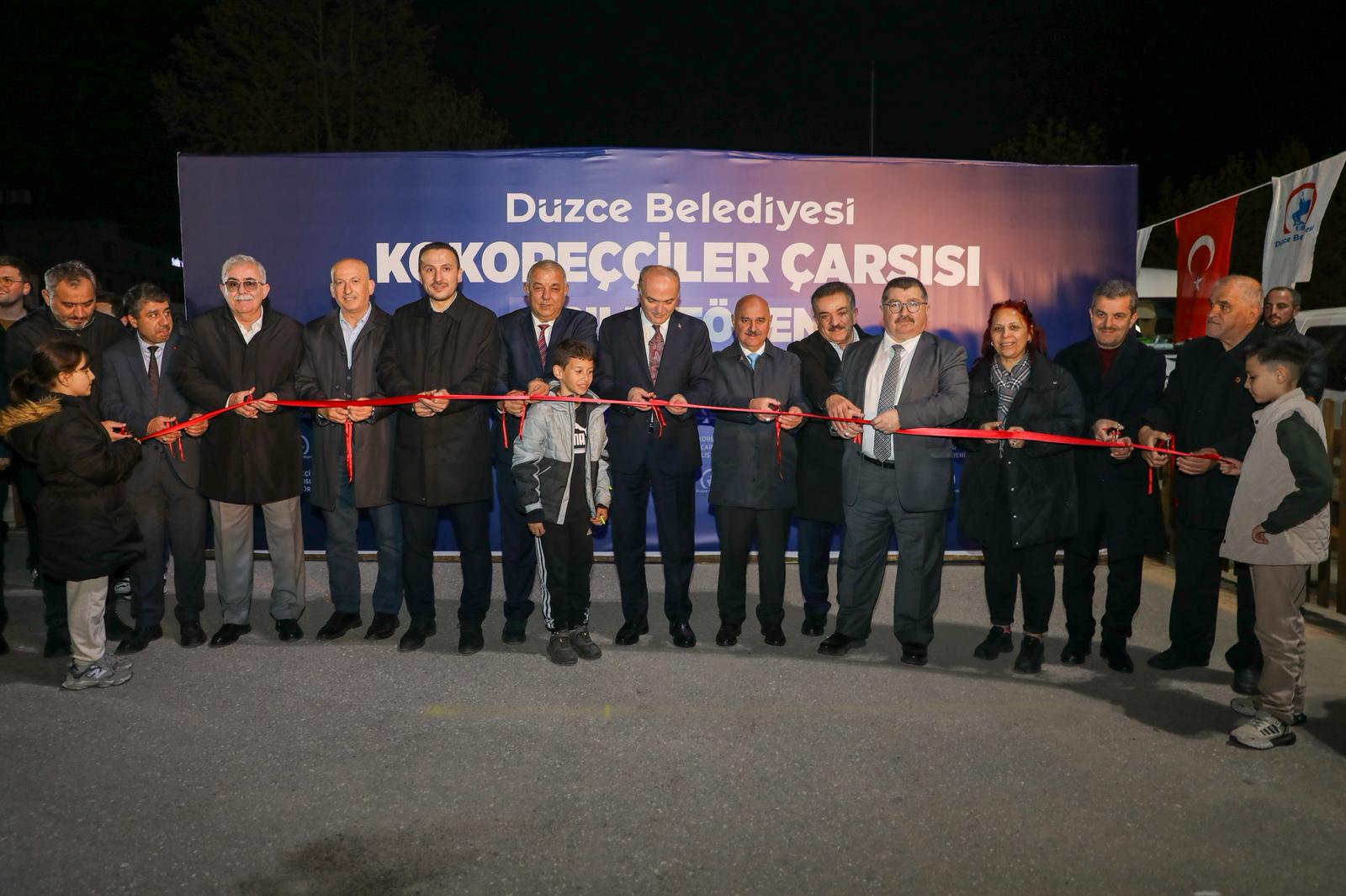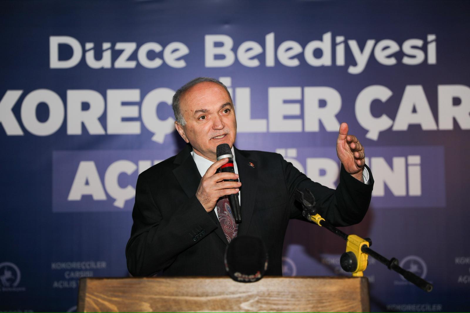 Törende konuşan Belediye Başkanı Dr. Faruk Özlü, kokoreççilerin daha önce Asar Deresi kenarında, fiziki koşulları yetersiz bir alanda hizmet verdiğini hatırlatarak, “Orası derme-çatma bir yerdi. Hijyen sorunları vardı, tuvalet ihtiyacı dahi tam anlamıyla karşılanamıyordu. Burayı taşımamız gerekiyordu. Burası gerçekten Düzce’nin merkezine makul mesafede olan bir yer. Belki de ilk defa bir gece açılışı yapıyoruz. Çünkü burası Kokoreççiler Çarşısı. Ben bu vesile ile bazı arkadaşlara teşekkür etmek istiyorum. Sayın Mehmet Habiboğlu’nun ve Nurhan Kartal’ın. Milli Emlak’ın yerinde bu tesisleri inşa ettik. Bu binaların yapımına katkı sağlayan arkadaşlarımıza teşekkür ediyorum. Düzce’mize hayırlı uğurlu olmasını diliyorum” dedi.